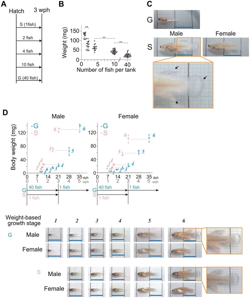 In many studies using African turquoise killifish, newly hatched fish are initially kept in groups of 4-200 individuals per tank [16–21]. To investigate the effect of housing density on juvenile growth, we reared newly hatched fish at densities of 1, 2, 4, 10, and 40 fish per S-tank (15 × 9 × 10 cm, 0.65 L water) (Figure 1A), according to the protocol described by Dodzian et al. [18] with minor modifications. Because food availability affects growth, all the fish were fed in sufficient amounts until their abdomens turned orange, a sign of full satiation [18]. At three weeks posthatching (wph), we investigated body weight, and found that lower housing densities resulted in faster growth (Figure 1B). The average weight in single housing (one fish per tank) was 5.4 times greater than the average weight in group housing at the highest density (40 fish per tank). The average weight in single housing was also 1.7 times greater than the average weight in group housing at the second-lowest density (two fish per tank). In addition at three wph, single-housed juveniles reached the onset of sexual maturity stage, where male fin coloration was observed (Figure 1C, black arrows in pictures). On the other hand, group-housed fish at the highest density (40 fish per tank) had just reached the middle stage of juvenile growth (Figure 1C). These results suggest that in the juvenile stage, lower housing densities lead to faster growth.