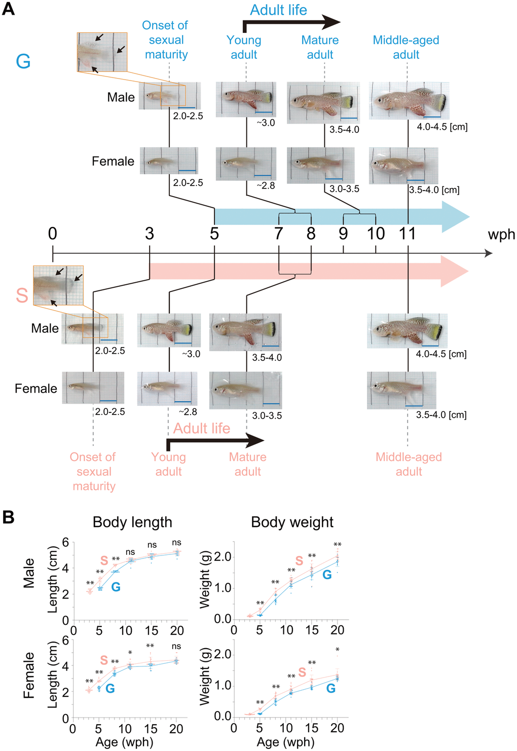 Next, to examine whether group or single housing in the juvenile stage affected the body growth during sexual maturation, we observed the temporal growth from the onset of sexual maturity stage (group-housed fish, five wph; single-housed fish, three wph) in group- and single-housed fish (Figure 2A). As sexual maturation progressed, the body coloration of males spread from the fin to the entire body, and the abdomen of females became rounded, in both group- and single-housed fish (Figure 2A). The young adult fish are fully sexually mature and capable of breeding. The group- and single-housed fish reached the young adult stage at seven and five wph, respectively (Figure 2A). The timing of reaching this stage was within the range of the previously reported timings in captivity (4-8 wph) [18, 20–26]. The comparison of group- and single-housed fish at the same life stage from the onset of sexual maturity to middle age indicated that whether group housing or single housing in the juvenile stage had no effect on the change in appearance of fish during sexual maturations (Figure 2A).