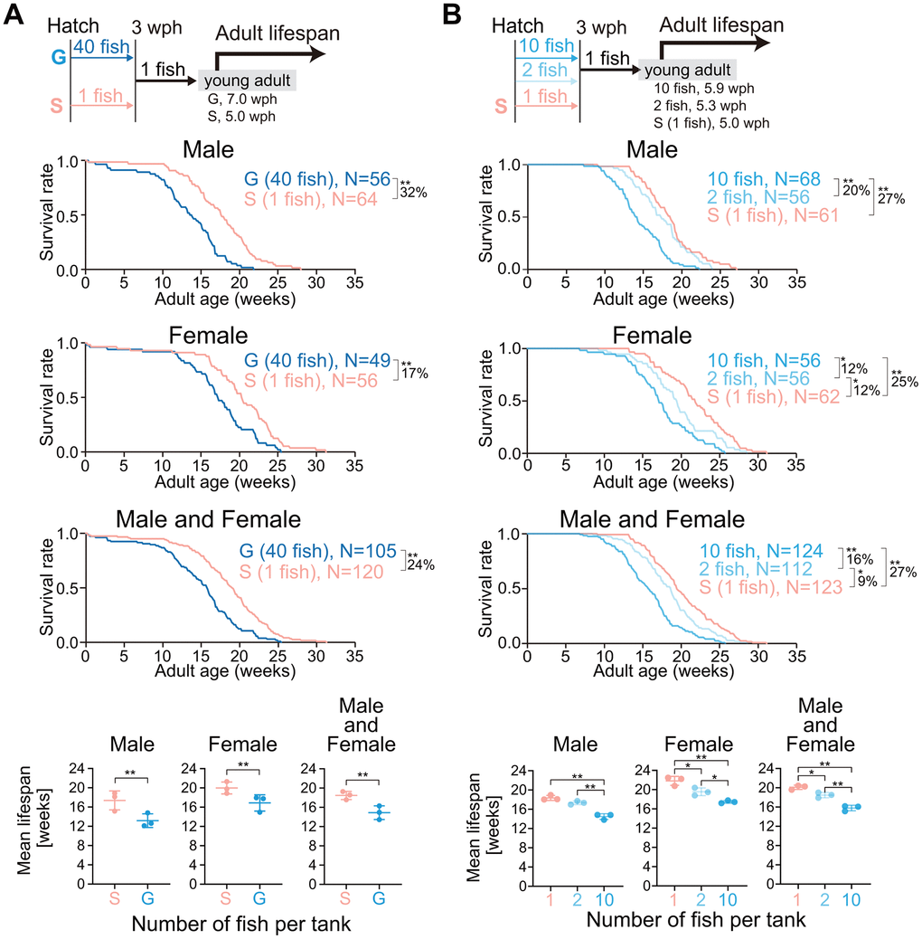 Single housing in the juvenile stage accelerated the rate of body growth (Figure 1). In general, the growth rate is inversely correlated with lifespan [2]. Thus, we expected that the single-housed fish (fast-growing fish) would live for shorter periods than the group-housed fish (slow-growing fish). Unexpectedly, the mean adult lifespan in single-housed fish was longer than that in group-housed fish in both sexes (Figure 3A, male, 32%; female, 17%; male and female, 24%; Supplementary Figure 2A). Because juvenile growth was dependent on juvenile housing density (Figure 1A, 1B), we suspected whether the adult lifespan also exhibited a dependence on juvenile housing density. To test this hypothesis, we reared newly hatched fish at densities of 1, 2, and 10 fish per S-tank, and then, reared all the fish at a density of one fish per L-tank from three wph onward, and measured the adult lifespan (Figure 3B, upper schematic diagram). Both fish housed at a density of one or two fish per tank exhibited a longer mean adult lifespan than fish housed at a density of 10 fish per tank in both sexes (Figure 3B and Supplementary Figure 2B). These results suggest that lower housing densities in the juvenile stage extend adult lifespan despite fast body growth, which is contrary to the commonly held idea that growth rate and lifespan are inversely correlated.