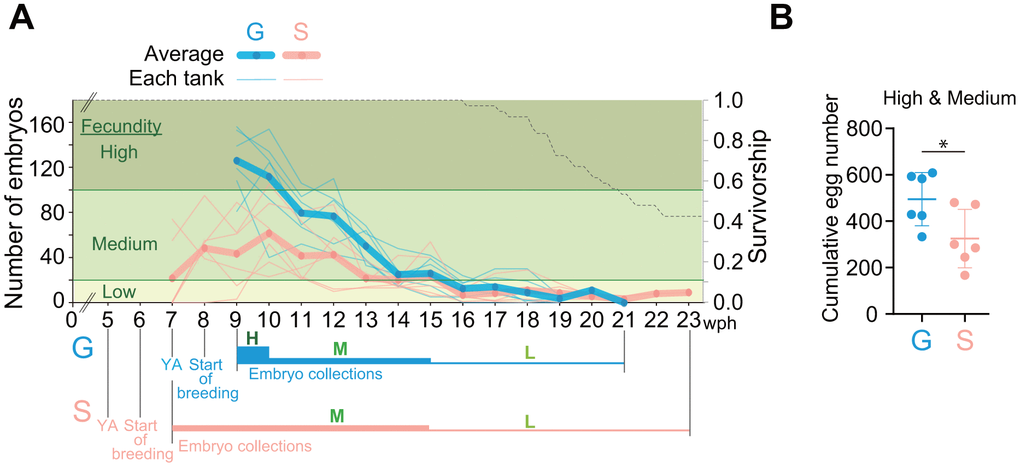 Adult lifespan of single-housed fish was longer than that of group-housed fish (Figure 3A). Therefore, we suspected that the egg-laying period of single-housed fish was also longer than that of group-housed fish. To test this possibility, we conducted weekly monitoring of temporal changes in the number of eggs laid until the old adult stage (Figure 4A). In group-housed fish, the number of eggs laid was high for the first two weeks, medium for the subsequent five weeks and low thereafter, whereas, in single-housed fish, it was medium for the first nine weeks and low thereafter (Figure 4A). The cumulative number of live embryos in single-housed fish was less than that in group-housed fish (Figure 4B). These results suggest that the egg-laying period of single-housed fish is longer than that of group-housed fish, although the number of eggs laid is not very high.