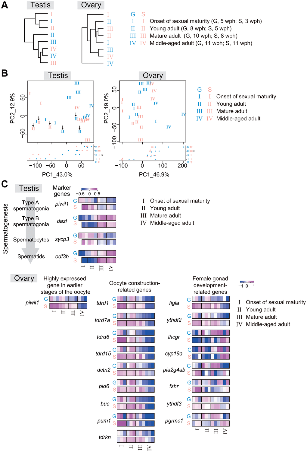 We suspected that the reduction in offspring number and increase in the egg-laying period in single-housed fish may be related to transcriptomic differences in the gonads. Therefore, we performed RNA sequencing analysis of testes or ovaries at four life stages: I, the onset of sexual maturity (G, 5 wph; S, 3 wph); II, young adult (G, 8 wph; S, 5 wph); III, mature adult (G, 10 wph; S, 8 wph); and IV, middle-aged adult (G, 11 wph; S, 11 wph) (Figure 2A). Interestingly, hierarchical clustering showed that single-housed fish tended to exhibit higher similarity to group-housed fish at earlier life stages than to group-housed fish at the same life stage in both the testes and ovaries (Figure 5A). For example, in the testes, single-housed fish at stage II exhibited the highest similarity to group-housed fish at stage I; in the ovaries, single-housed fish at stage II and III exhibited higher similarity to group-housed fish at stage I. These results suggest that the rate of gonadal transcriptional change with life stage progression in single-housed fish is slower than that in group-housed fish.