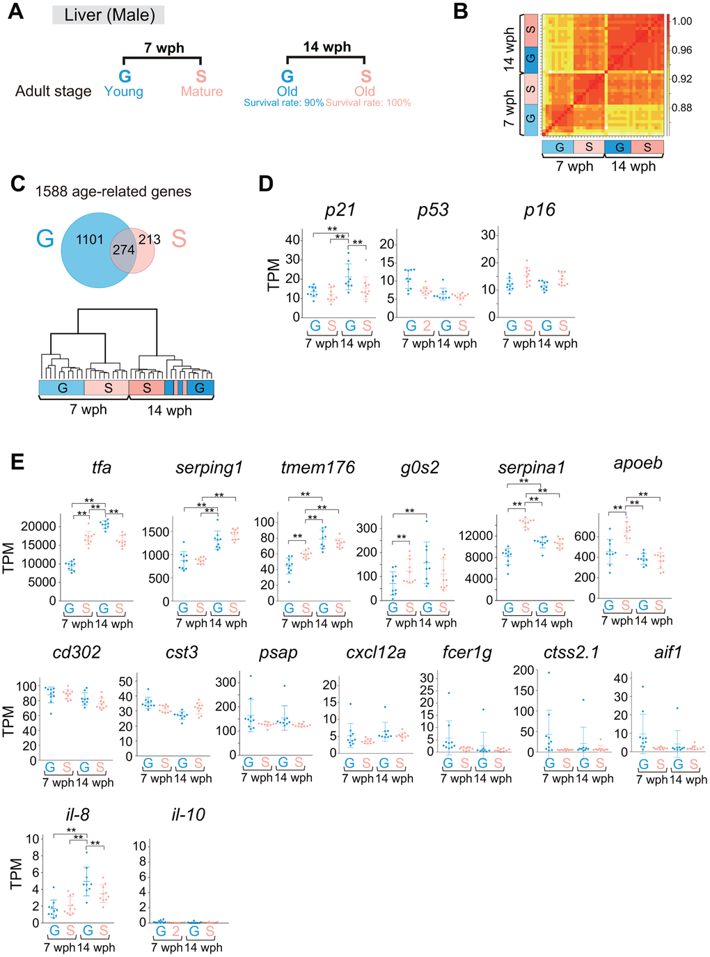 As single-housed adult fish lived longer than group-housed fish, we suspected that the rate of the aging process in single-housed fish was slower than that in group-housed fish. Organismal metabolism changes with age [3], and the liver plays a central role in the organismal metabolic processes. Therefore, we compared the gene expression profiles of livers from group- and single-housed fish at two different ages: 7 wph (early adulthood) and 14 wph (late adulthood) (Figure 6A). Interestingly, the correlation coefficients between all samples showed that group- and single-housed fish at 14 wph were very similar to each other (Figure 6B), despite the 2-week difference in adult age between group- and single-housed fish (Figures 2A, 6A). We identified 1588 age-related differentially expressed genes (DEGs) between 7 wph and 14 wph in either group- or single-housed fish. The hierarchical clustering of all samples based on the similarity of changes in the expression of the 1588 age-related genes also indicated that the expression profiles of the group- and single-housed fish were similar at 14 wph (Figure 6C, lower).