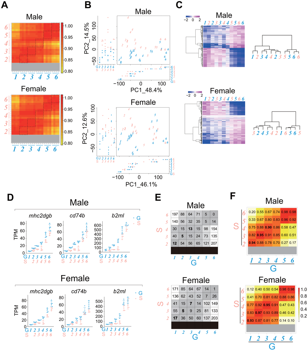 Analysis of the internal transcriptional programs in the gonads and liver suggested that single-housed fish have a slower rate of life-stage progression and aging process than group-housed fish. We wondered whether the rate of change in the gene expression profile of juveniles with growth in single-housed fish might also be slower than that in group-housed fish. To address this question, we conducted time-series sampling across growth stages 1–6 for both males and females (Figure 1D). Then, we compared transcriptomes between group- and single-housed juveniles at the same growth stages. The correlation coefficients between samples showed that the gene expression profiles were quite similar between group- and single-housed juveniles at the same growth stages in both sexes (Figure 7A).