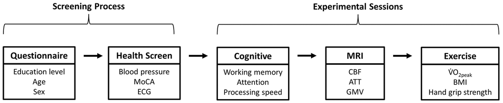 Participants were screened for eligibility before completing three experimental sessions on different days. Figure 4 shows the key outcome measures and desired session order (achieved for 87% of participants, with all experimental sessions completed within 5.2 ± 3.2 weeks, and with 13 ± 15 days between MRI and exercise sessions (<30 days for 91%). Participants refrained from vigorous physical activity, which acutely alters CBF [76], for 24 hrs prior to the MRI session.