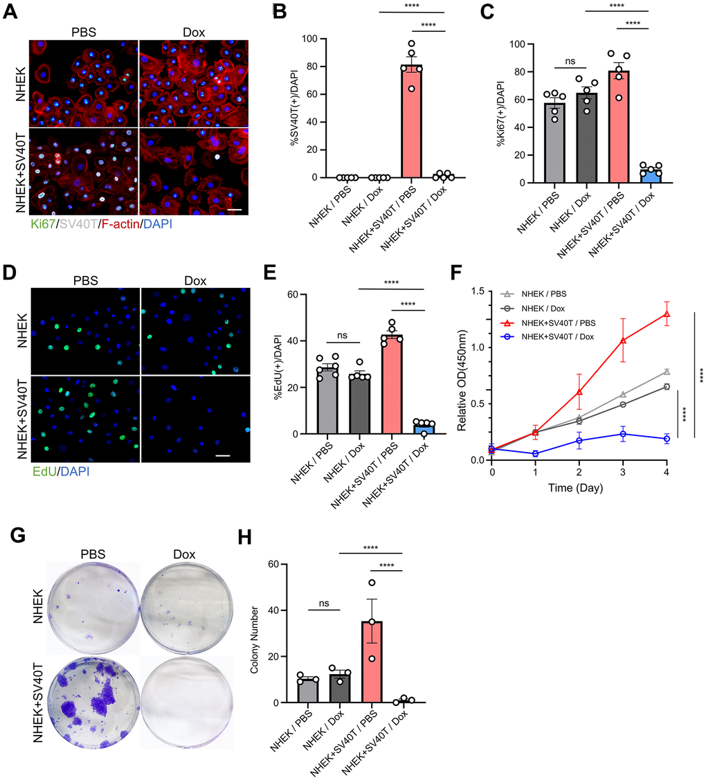 To investigate the effects of the expression and subsequent terminalization of immortalization genes on the human keratinocytes, we established reversibly immortalized NHEK utilizing lentiviral vector containing the SV40T gene with doxycycline-inducible Tet-Off promoter. The transfection of the Tet-Off system allows the continuous expression of the target gene, in our case, SV40T antigen, and subsequently stops its transcription once the tetracycline or doxycycline were added to the cell culture. We initially assessed the expression of SV40T in Tet-Off-SV40T-transfected NHEKs and in sham NHEKs with immunofluorescence staining. In normal keratinocytes, there was no detectable expression of SV40T antigen in neither PBS nor Dox group. However, in cells transfected with the constructed Tet-Off-SV40T plasmid, SV40T antigen was expressed in over 80% of the cells. Furthermore, the addition of doxycycline (Dox) almost completely abolished the expression of SV40T in these cells, confirming the effectiveness of our Tet-Off system and the successful establishment of the reversibly immortalized keratinocytes (Figure 1A, 1B). Immunofluorescence staining also revealed that the expression of Ki67 in immortalized cells is significantly upregulated compared to normal cells, and with the doxycycline-induced suppression of SV40T expression, there presented a significant decrease in Ki67 expression, falling below the levels observed in normal cells (Figure 1A, 1C). EdU staining experiments demonstrated a similar trend (Figure 1D, 1E). CCK-8 assay was performed on both sham NHEKs and reversibly immortalized NHEKs with either PBS control or Dox. The CCK-8 curves showed an upregulated proliferation capacity in immortalized NHEKs, while subsequently terminating the SV40T genes resulted in a vast drop in the curve (Figure 1F). In the clonogenic assay, it can be observed that doxycycline did not significantly affect the clonogenic ability of sham NHEKs. However, in reversible immortalized cells, the number of cell colonies formed under doxycycline induction is significantly reduced, contrasting with the significant number of clone clusters in the immortalized cell group (Figure 1G, 1H). The aforementioned findings indicate that, subsequent to the inactivation of the SV40T gene, reversibly immortalized cells do not revert to their initial proliferative state. Rather, cellular proliferation decreases drastically, with little to non-colony forming abilities.