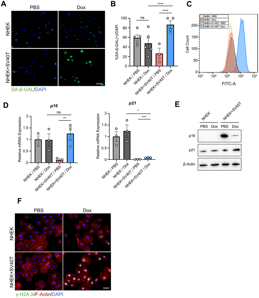 In this study, we established a reversibly immortalized cell line by expressing SV40T in keratinocytes using the Tet-Off lentiviral system. Subsequently, we induced a senescent phenotype by terminating the expression of SV40T with doxycycline induction. SV40T antigen is known for its role in cell cycle regulation by inactivating key tumor suppressor proteins such as p53 and the retinoblastoma protein (Rb), which allows the cells to bypass normal senescence checkpoints and continue dividing. It was found that subsequently knocking out the introduced SV40T gene in immortalized epithelial cells leads to telomere shortening, ultimately leading to a state of premature senescence [6]. We verified that the approach of terminating the expression of SV40T gene led to keratinocyte senescence, providing a unique model to study keratinocyte aging. Subsequent RNA sequencing aims to uncover changes in gene expression and related signaling pathways, with a particular focus on SASP-related genes. Our research offers the potential to deepen our understanding of the molecular mechanisms of keratinocyte senescence and its impact on skin aging.