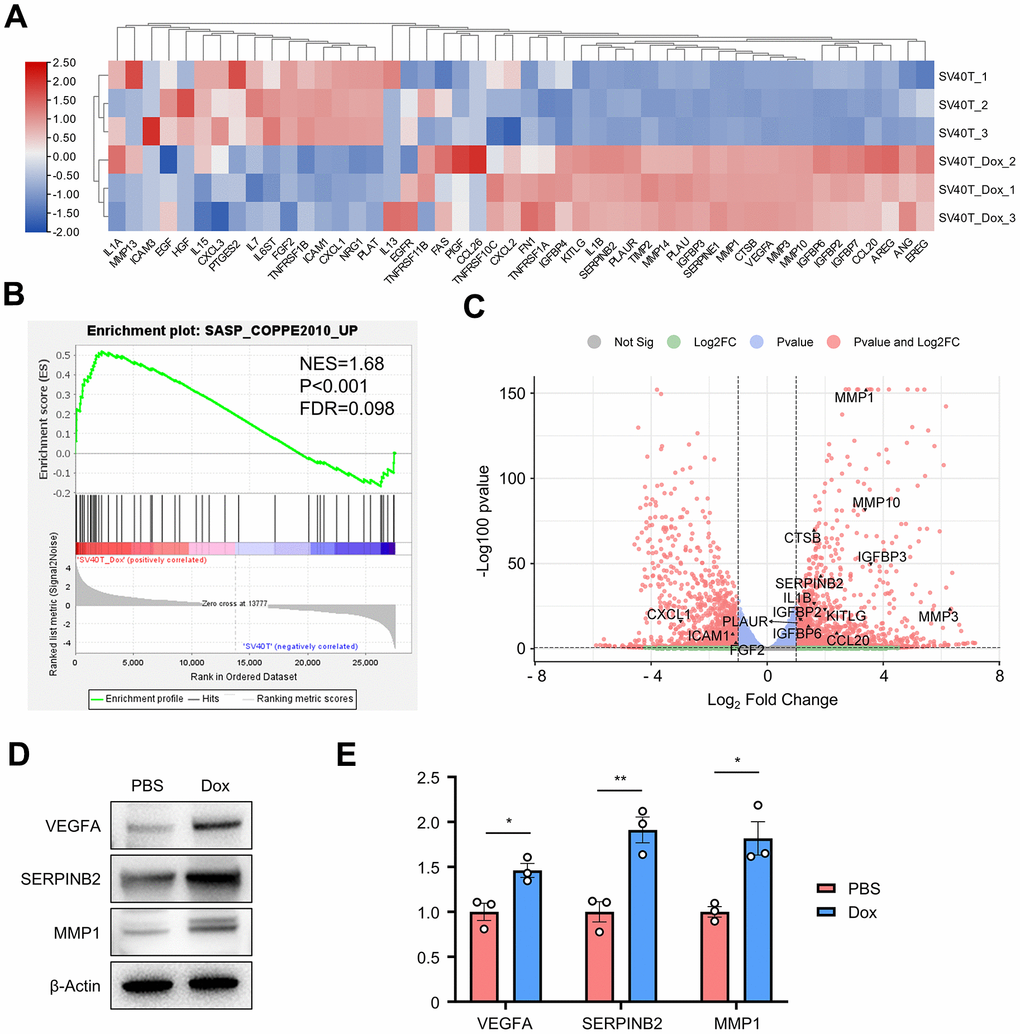 Cellular senescence leads to an irreversible arrest of the cell cycle and induces significant phenotypic alterations, including the generation of a series of bioactive secretome, known as the senescence-associated secretory phenotype (SASP). To identify whether SASP plays a key role in the senescence of reversed immortalized keratinocytes, a GSEA gene set for senescence-associated genes was acquired from previous studies (Supplementary Table 1) [13, 14]. 48 genes within the SASP-related gene set were found expressed in our cell samples, with their expression plotted in the clustered heatmap (Figure 4A). More than half of those genes were generally upregulated in Dox group, including MMPs, IGFBPs, SERPINs, interleukins and growth factors. GSEA analysis resulted in significant enrichment in such SASP-related gene set with NES=1.68, p-value<0.001 and FDR=0.098 (Figure 4B). Top significant genes were annotated in the volcano plot of all DEGs (Figure 4C). MMP3, SERPINB2 and VEGFA as typically expressed proteins from SASP results were verified upregulated in reversed immortalized keratinocytes in both Western blot and qPCR (Figure 4D, 4E).