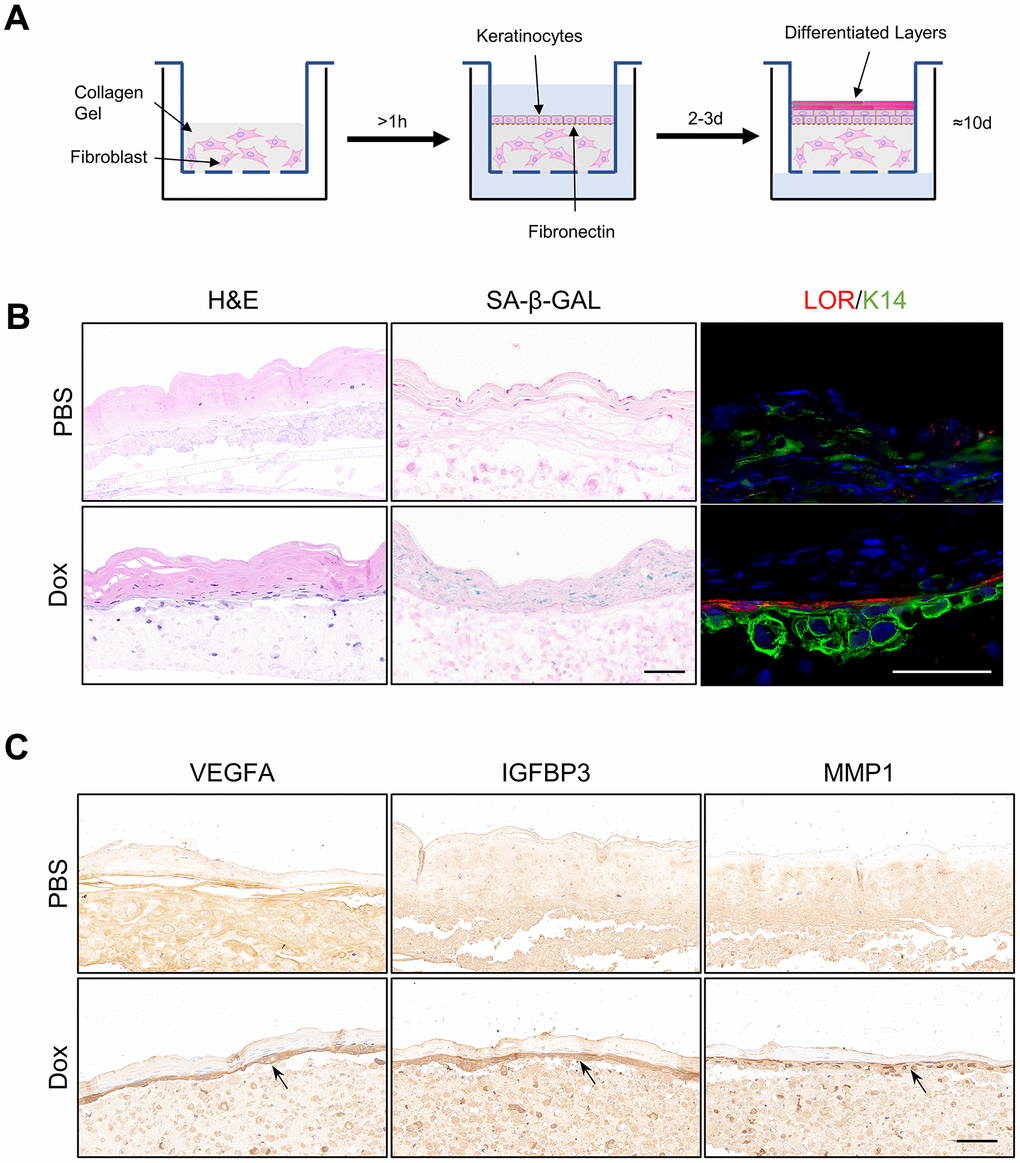 To further verify above results, full-thickness organotypic 3D skin models were constructed with reversibly immortalized keratinocytes as described (Figure 5A, Methods and Materials). Structure of normal epidermis, including basal layer, differentiated layer and cornified envelope were observed in the H&E staining of Organotypic 3D skin models. Staining of SA-β-GAL in the epidermis was upregulated in the ones composed of reversed immortalized keratinocytes with Dox induction for more than one week, indicating the aging of organotypic epidermis. Immunofluorescence staining of Loricrin exhibited enhanced differentiation, consistent with previous results from RNA-sequencing (Figure 5C). However, we noted that the marker of epidermal basal cells, K14, is downregulated in immortalized cells within the 3D model, which may imply the loss of stemness, of which the reason remains to be debated. Finally, we utilized such senescent organotypic 3D skin model to validate the level of the SASP. Our findings indicate a notable increase in the expression of representative SASP proteins VEGFA, IGFBP3, and MMP1 in the epidermis of the senescent 3D skin models treated with Dox, particularly in the basal layer. These results suggest that the increase of SASP is predominantly localized to the basal cells of the epidermis, which may play a crucial role in driving the aging process of the epidermis. The location of the increase in SASP factors may also imply the contribution of basal keratinocytes to the structural and functional alterations observed in aged epidermal tissue.