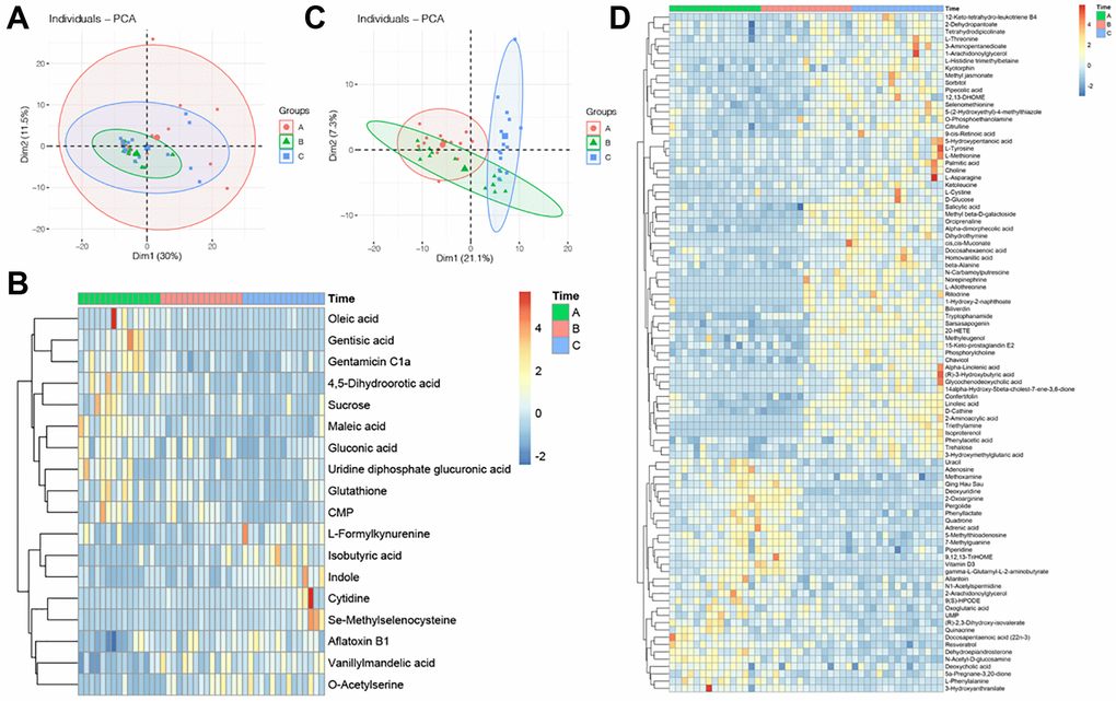 After the normalization of the intensity of metabolites, PCA was performed. The PCA scatter plot of metabolomics data from the FF in the three groups showed that there was a cluster between Group A and Group C, but did not differ significantly between Group A and Group B (Figure 1A). Then, we performed a hierarchical clustering analysis of the screened differential metabolites in all the groups, distinguishing them by different colors. Regions with similar colors represent that metabolites in that region have similar functions or participate in a biological process together, while larger color differences indicate that the functions of metabolites in these regions are far apart. Here, 93 metabolites showed gradual variations in different groups, with 61 gradually elevating and 32 gradually declining (Figure 1B).