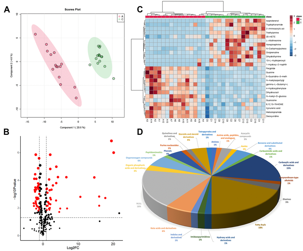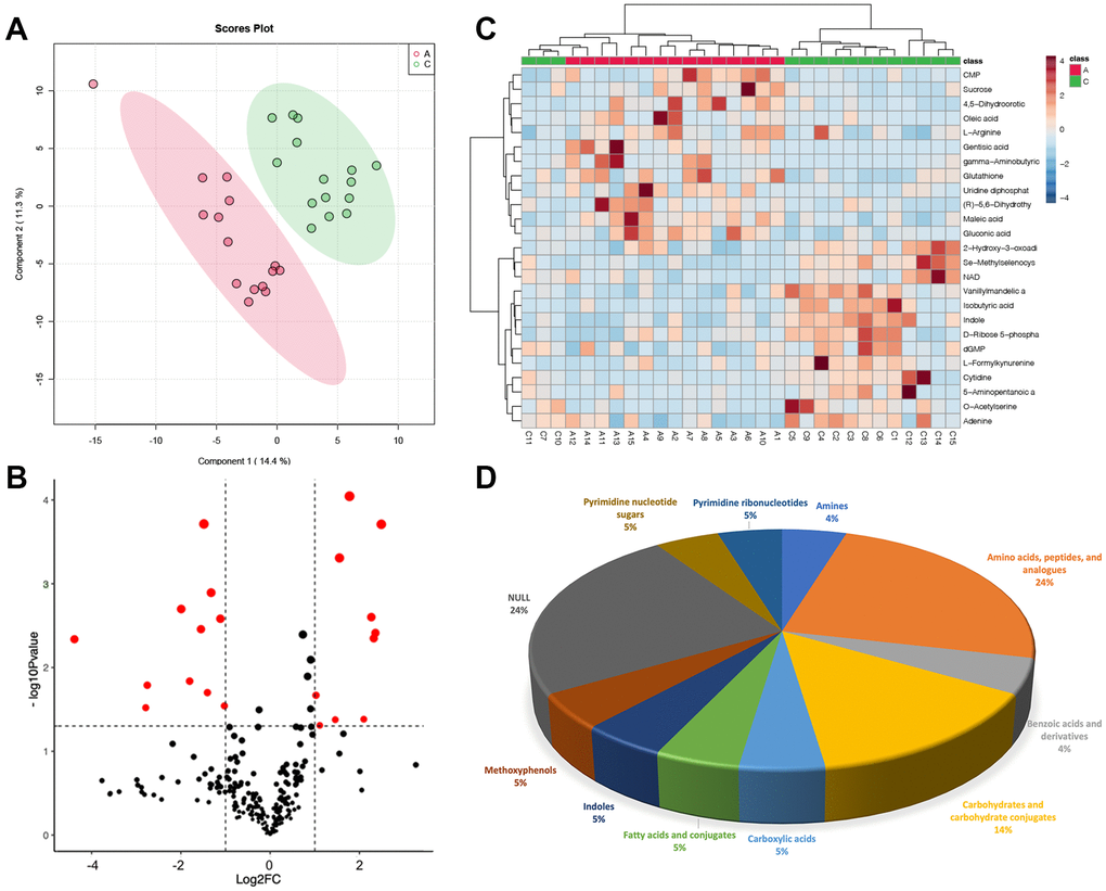 PCA cannot ignore within-group errors, eliminate random errors unrelated to the purpose of the study, and is not conducive to finding differences between groups, therefore, PLSDA was utilized to obtain metabolites that differed significantly between Group A and Group C (Figure 2A). Then, differential metabolites in the two groups were screened, and we got 21 metabolites that differed greatly between Group A and Group C (Figure 2B): 11 were up-regulated and 10 were down-regulated (Supplementary Table 1). Heatmap showed the top 25 differential metabolites (Figure 2C), among them, five metabolites (24%) belong to amino acids, peptides, and analogs, three metabolites (14%) belong to carbohydrates and carbohydrate conjugates, and five metabolites (24%) cannot be classified to any sub-class, the rest of metabolites belonged to amines (4%), benzoic acids and derivatives (4%), carboxylic acids (5%), fatty acids and conjugates (5%), indoles (5%), methoxyphenyl (5%), pyrimidine nucleotide sugars (5%) and pyrimidine ribonucleotides (5%), respectively (Figure 2D).