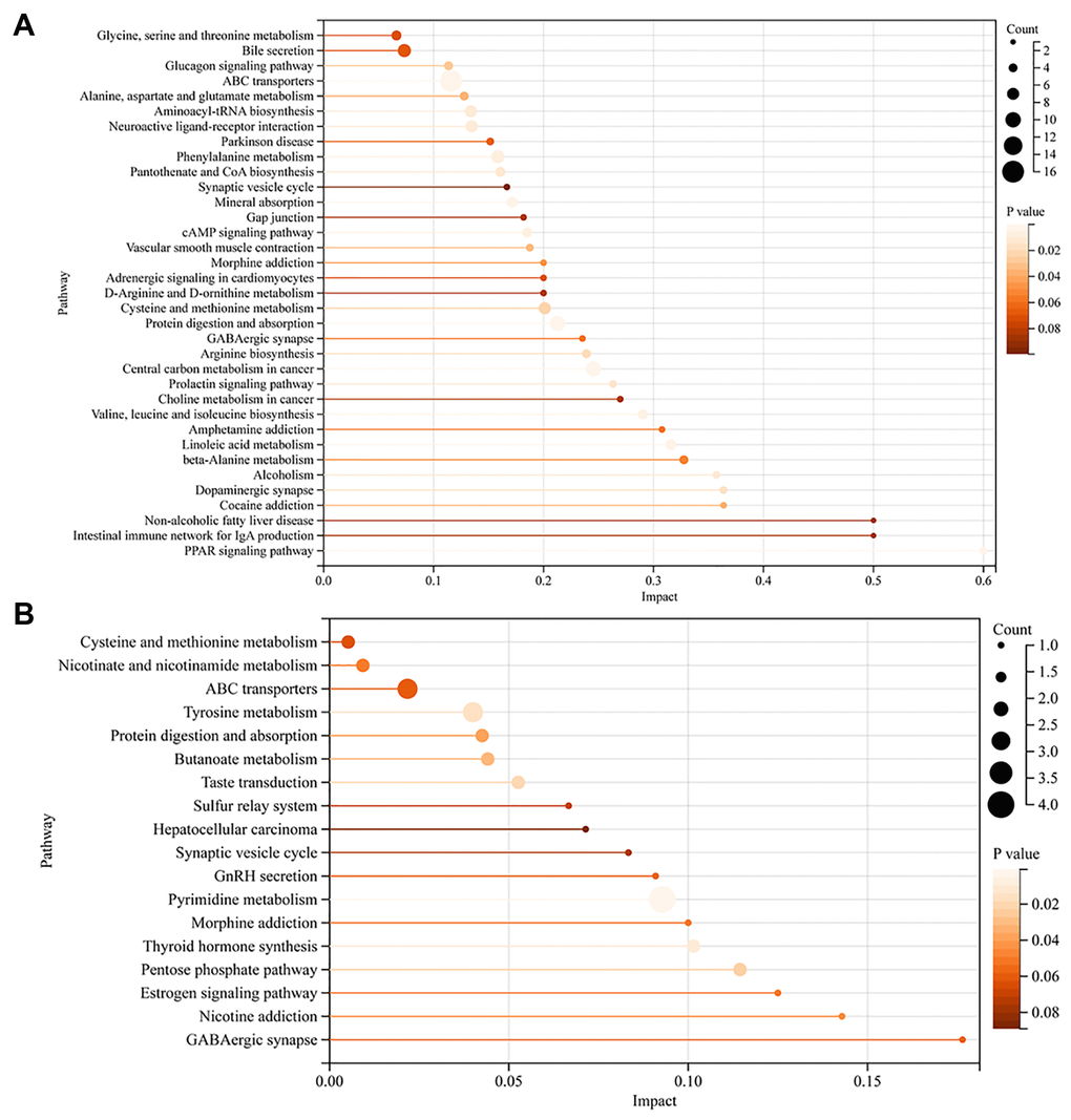 To further analyze the function of these differential metabolites, we performed a KEGG enrichment analysis. Through metabolic pathway analysis (MetPA), the associated metabolic pathways of the two groups of differential metabolites were analyzed, the hypergeometric test was used for data analysis and the pathway topology is the relative-betweenness centrality. The pathway impact value represents the importance of the pathway by summing the importance measures of the differential metabolites enriched to the pathway and is divided by the sum of the importance measures of all metabolites on the pathway, which is the pathway impact value. In brief, the larger the value, the more important the pathway.