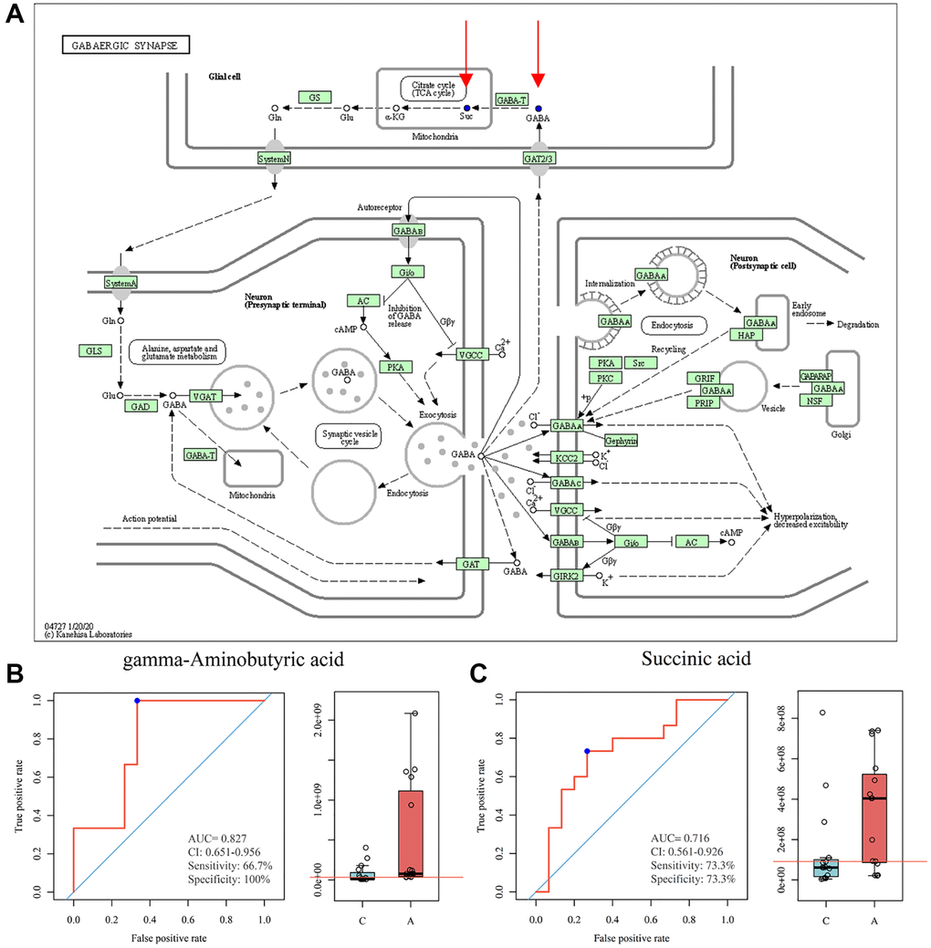 For GC, 43 metabolic pathways were enriched, 18 pathways had a P-value < 0.1, and 8 pathways had a P-value < 0.05 (Figure 4B). Notably, the pentose phosphate pathway, nicotinate and nicotinamide metabolism, GnRH secretion, and estrogen signaling pathway were also involved in the enrichment of differential metabolites. We then took the intersection of the pathways notably enriched by the two sets of samples and found that 6 pathways were co-enriched by the differential metabolites of FF and GC: protein digestion and absorption, ABC transporters, GABAergic synapse, morphine addiction, synaptic vesicle cycle, cysteine, and methionine metabolism. Among them, we noticed that the pathway, GABAergic synapse, had a high impact value in both FF and GC enrichment. After screening the metabolites involved in this pathway, we found that GABA was down-regulated in GC, while its downstream metabolite succinic acid was down-regulated in FF (Figure 5A). Further ROC curve analysis was performed on these two metabolites and results showed that they all had a favorable predictive value (Figure 5B, 5C).