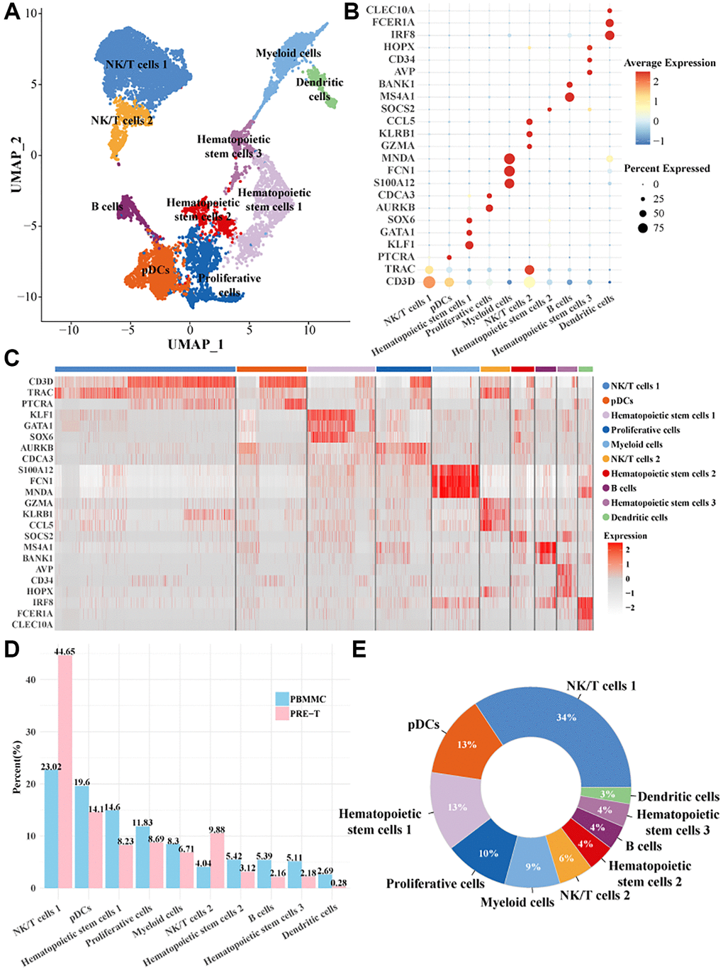 The scRNA-seq analysis was performed to investigate the cellular subpopulations and related molecular characteristics of Pre-T-ALL samples (grouped as PRE-T) and healthy bone marrow samples (grouped as PBMMC). After cell data filtering, normalization, and downscaling and clustering analyses, a total of 24,505 cells were obtained and clustered into 10 cellular subpopulations (Figure 1A). The expression of the marker genes in cellular subpopulations were as follows: CLEC10A gene had a significantly high expression level and a high percentage expression in dendritic cells; IRF8 gene was also high-expressed in dendritic cells but with a slightly lower percentage of expression; CD34 gene was high-expressed in hematopoietic stem cells 1; AURKB gene was high-expressed in proliferating cells and had a higher percentage of expression; GZMA and KLRB1 genes were significantly expressed in the NK/T cell 1 subpopulation (Figure 1B, 1C). We found that the number of NK/T cells 1 and NK/T cells 2 were higher in the PRE-T group (Figure 1D, 1E). This suggested that NK/T cell function may be altered in pre-T ALL, and that these alterations could promote disease progression.
