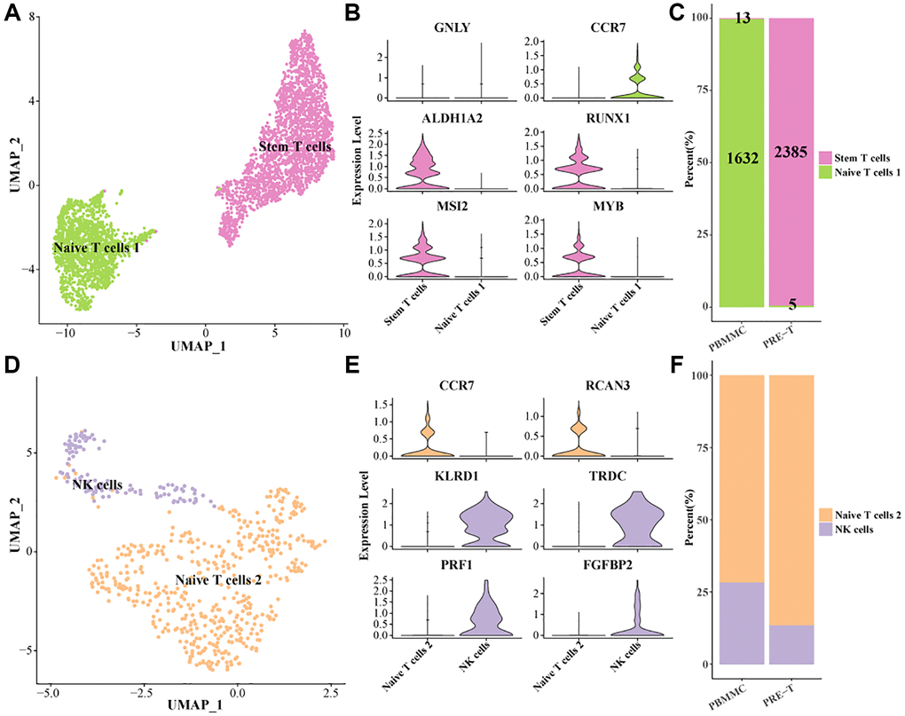 To characterize the heterogeneity of NK/T cells in Pre-T-ALL, NK/T cells 1 were further divided into two subpopulations (stem T cells and Naive T cells 1) in this study (Figure 2A). Specifically, stem T cells high-expressed hematopoietic stem cell-related marker genes ALDHA2, RUNX1, MSI2, MYB, and Naive T cells 1 high-expressed CCR7 (Figure 2B). Interestingly, 2,385 of all the stem T cells were found in the PRE-T group, while only 5 were found in the PBMMC group. The vast majority of stem T cells in the PRE-T group suggested a potential association between stem T and Pre-T-ALL pathogenesis and progression (Figure 2C). Next, we further divided NK/T cells 2 into two subpopulations (Figure 2D). Among them, Naive T cells 2 high-expressed CCR7 and RCAN3, while NK cells high-expressed marker genes such as KLRD1, TRDC, PRF1 (Figure 2E). Meanwhile, it was found that the proportion of Naive T cells 2 was higher in PRE-T group as compared to PBMMC (Figure 2F). These findings reveal potential distributional and functional differences between stem T cells and Naive T cells in leukemia, which could help improve the understanding of the complex microenvironment in leukemia.