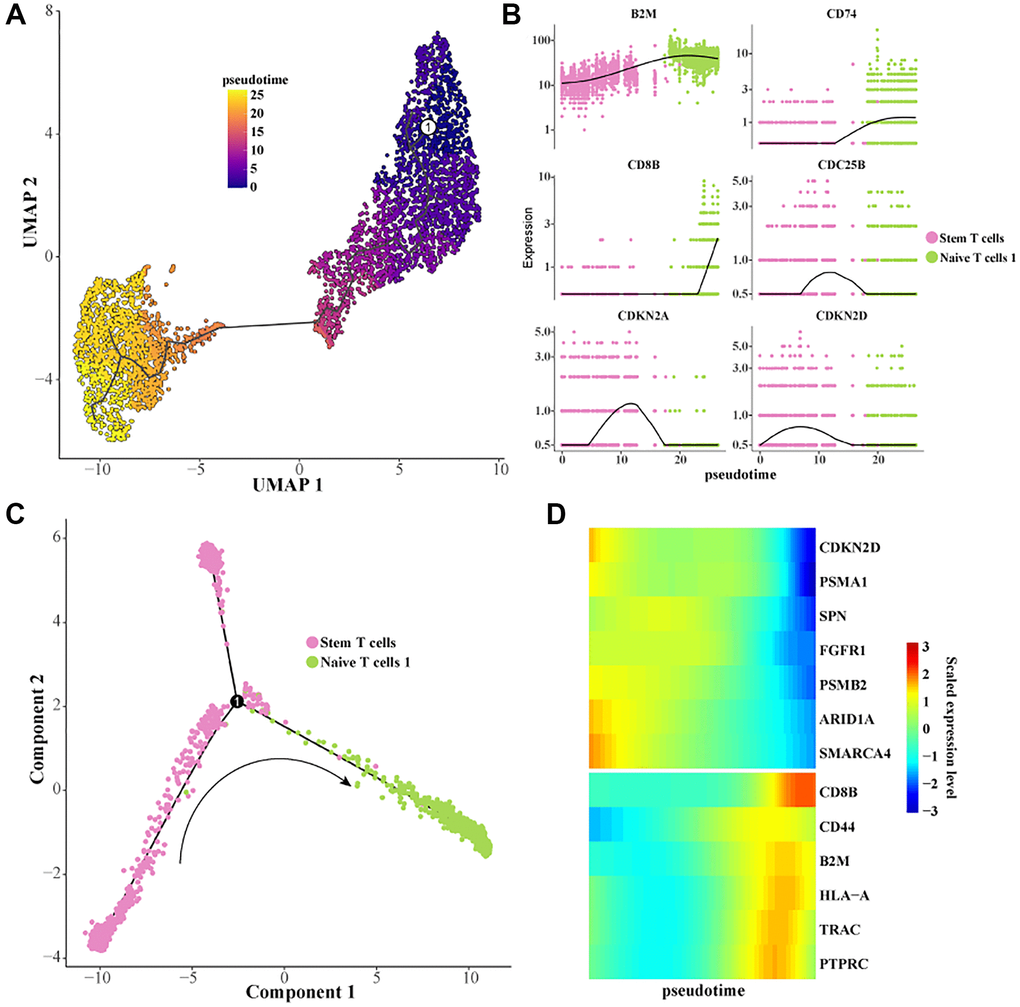To further characterize the dynamic evolution of stem T cells to Naive T cells, we constructed cell differentiation trajectories using Monocle 3 and Monocle 2 (Figure 3A, 3C). It was found that the expression levels of genes related to cell proliferation such as CDKN2D, CDC25B, FGFR1, PSMB2, etc., were gradually downregulated during the differentiation of stem T cells to Naive T cells. The expression levels of T cell activation-related genes such as B2M, CD8B, CD74, CD44, TRAC, etc. were gradually upregulated (Figure 3B, 3D). These results indicated that the cell proliferation ability was gradually inhibited and the T cell activation and activation ability was promoted during the differentiation of stem T cells to Naive T cells, which was of great significance in revealing the pathogenesis of Pre-T-ALL.