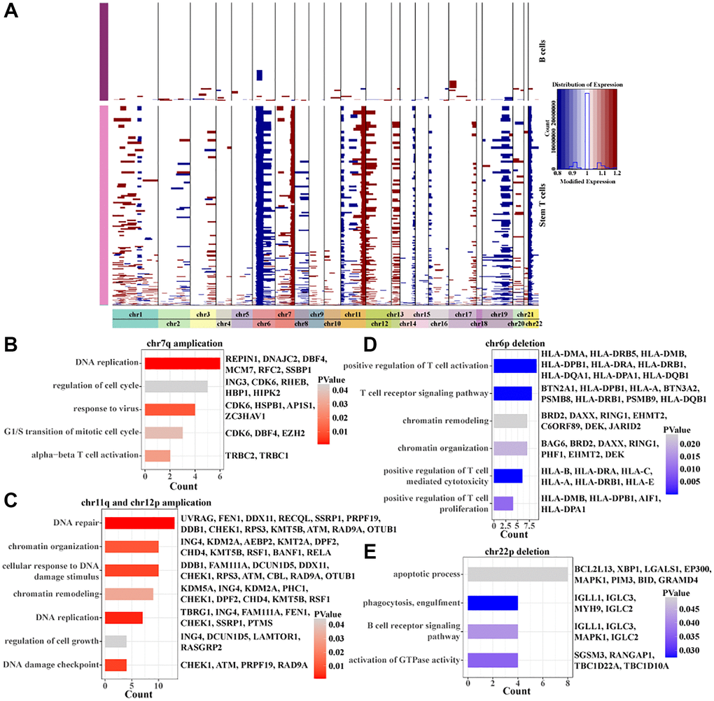 To further characterize the copy number variation of stem T cells in pre-T childhood leukemia, regions of amplification and deletion within 22 pairs of autosomes were identified using inferCNV. We found that stem T cells mainly had amplification of chr7q, chr11q, and chr12p and deletions of chr6p and chr22p (Figure 4A). Interestingly, the genes with the copy number amplification regions were all associated with cell cycle, proliferation, DNA replication, and cell growth (Figure 4B, 4C), while the genes with copy number deletion region were all related to T cell activation, apoptotic process, and T cell receptor signaling pathway (Figure 4D, 4E). These results suggested that enhanced proliferative capacity of stem T cells was associated with the amplification of chr7q, chr11q and chr12p and their declined immunoreactivity was associated with the deletion of chr6p and chr22p.