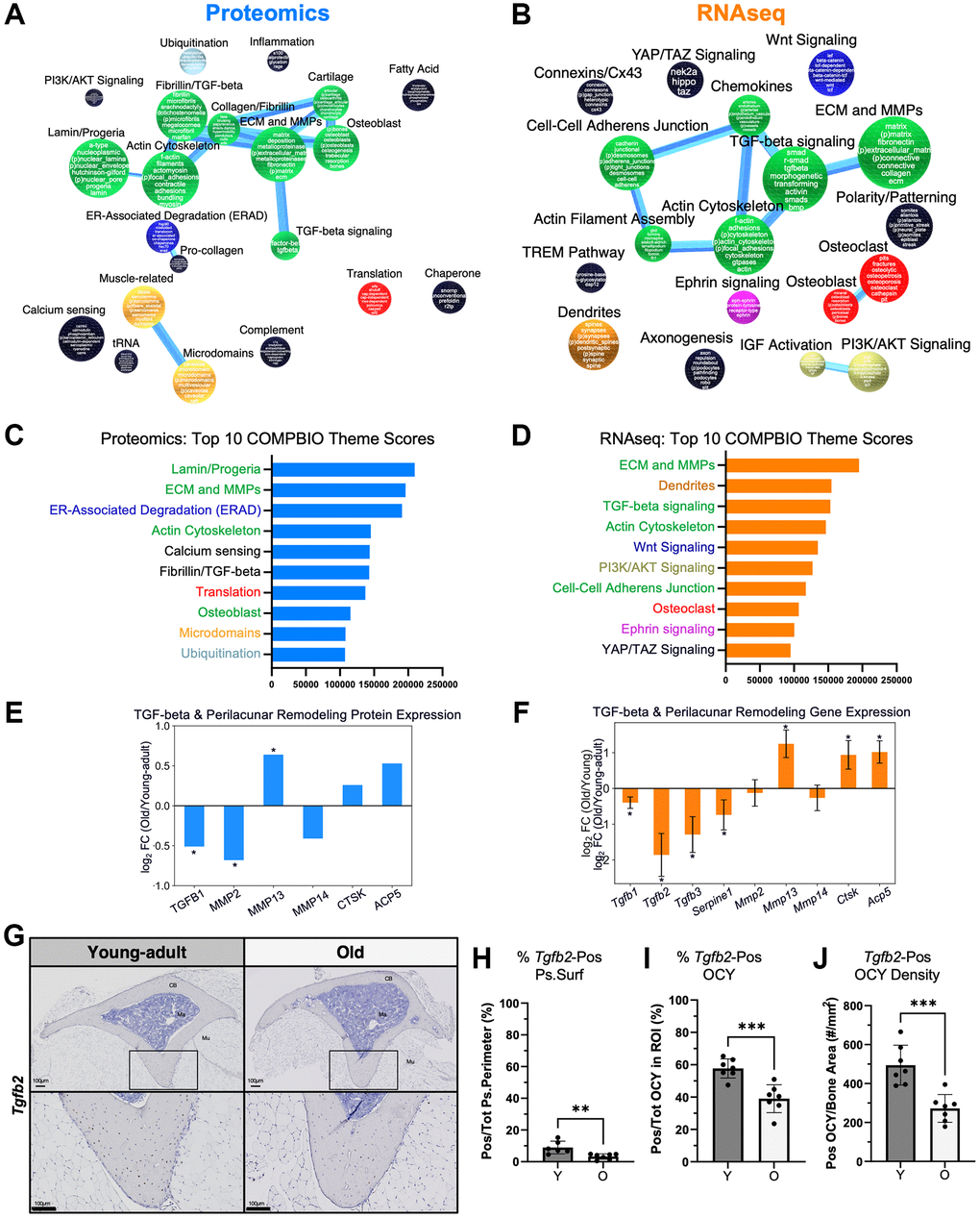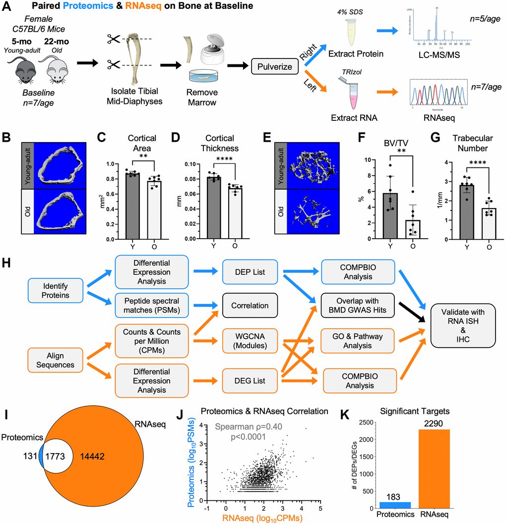 Paired tibias from young-adult and old mice at baseline were analyzed by proteomics and RNA-seq (Figure 1A, 1H). Femurs from these mice exhibited the expected age-related changes in bone morphology (Figure 1B–1G). After filtering, 1903 proteins were detected by proteomics, and 16273 genes were detected by RNA-seq (Supplementary Figure 1). At both the protein and RNA levels, multidimensional scaling (MDS) showed that young-adult samples separated from old samples. Of the detected proteins, 93% (1773/1903) were also detectable by RNA-seq (Figure 1I). Using the average peptide spectral matches (PSMs) and average counts per million (CPMs), the abundance of the 1773 targets detected by both proteomics and RNA-seq were correlated (Figure 1J), as reported [31]. The correlation was moderately positive (Spearman ρ = 0.40, p < 0.001), consistent with results in other tissues [31, 32]. Differential expression analysis between young-adult and old bone was performed separately for proteomics and RNA-seq. 183 proteins and 2290 genes met the p-value cutoff to be age-related differentially expressed proteins (DEPs) and differentially expressed genes (DEGs), respectively (Figure 1K).