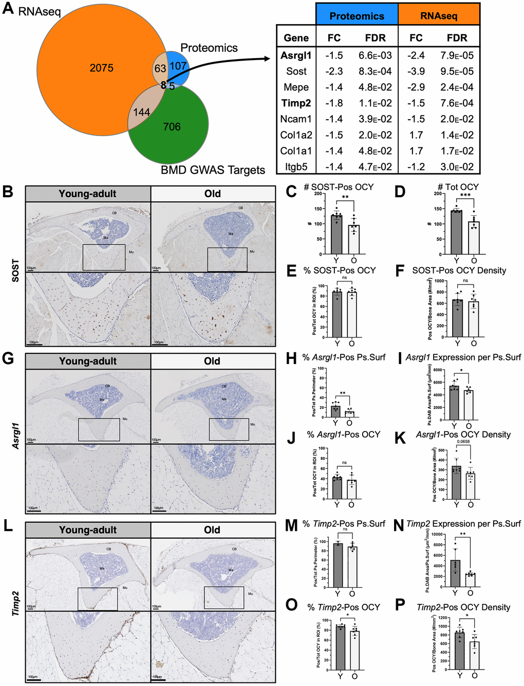 To better characterize Asrgl1 and Timp2, we used RNA ISH to confirm mRNA expression in bone cells and characterize the expression pattern in young-adult and old bone. Periosteal Asrgl1-expressing cells cover less than a quarter (23%) of the surface in young-adult bone, and this percentage is lower in old bone (12%, p = 0.004, Figure 2G, 2H). Consistent with this, the total periosteal surface expression of Asrgl1 (based on DAB-positive area) decreased with age (young: 5440, old: 4735 µm2/mm, *p = 0.040, Figure 2I). Slightly less than half of osteocytes also express Asrgl1 in young-adult bone (43%), and this percentage of positive osteocytes was not significantly lower with age (38%, p = 0.22, Figure 2J). The areal density of Asrgl1-positive osteocytes trended to be lower but did not reach significance (340 vs. 264 cells/mm2, p = 0.066, Figure 2K). While Asrgl1 expression is detected in fewer than one half of bone cells, Timp2 is expressed by most of the cells on the periosteal surface in young-adult and old bone (96% and 89%, respectively; Figure 2L, 2M). The total periosteal surface expression of Timp2 was decreased by half with age (young: 5115 vs. old: 2446 µm2/mm, p = 0.007, Figure 2N). Most osteocytes in young-adult bone also express Timp2 (88%), but this percentage decreases with age (76%, p = 0.025, Figure 2O), as does the areal density of Timp2-positive (858 vs. 649 cells/mm2, p = 0.019, Figure 2P). In summary, we observed reduced expression of Asrgl1 and Timp2 in bones of old mice using three methods—proteomics, RNA-seq, and RNA ISH.