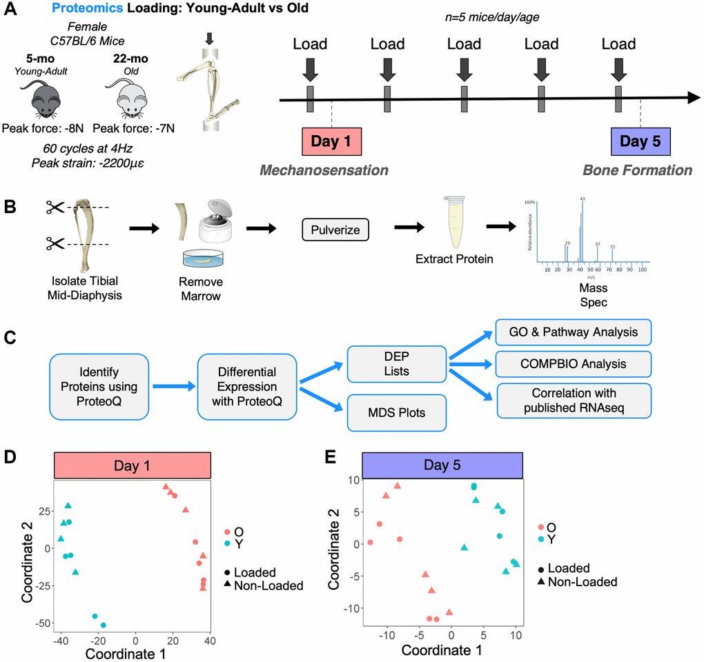 We next sought to study the proteomes of bones from young-adult and old mice following a mechanical loading stimulus. Tibias from a separate set of young-adult and old mice were loaded in vivo for 1 or 5 days (Figure 5A). Time points were selected to sample distinct phases of the loading response: early mechanosensation (day 1) and active bone formation (day 5). Paired loaded and non-loaded tibias were analyzed by proteomics (Figure 5B, 5C). After filtering, 2300 and 2140 proteins were detected by proteomics at days 1 and 5, respectively (Supplementary Figure 1). Multidimensional scaling (MDS) showed that young-adult samples separated from old samples regardless of loading status at day 1 (Figure 5D). As expected, at day 5, when bone formation is actively occurring [11], samples separated marginally better based on loading status, but the strongest proteomic differences were still due to age status (Figure 5E).