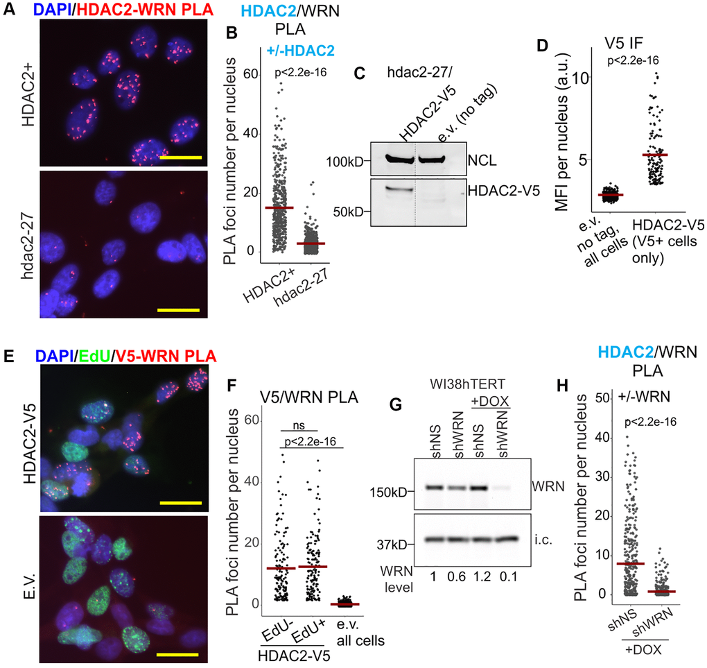 We developed PLA assays to visualize WRN/HDAC2 and WRN/HDAC1 physical proximities in situ. Robust WRN/HDAC2 PLA signal was detected in the GM639 cell line of SV40-immortalized fibroblasts and was dramatically reduced in the isogenic hdac2-27 null derivative (Figure 1A, 1B, also see Supplementary Figure 1A for a zoomed-out, split channel view of the same cells). A V5-tagged version of HDAC2 was introduced into hdac2-27 cells (Figure 1C, 1D), and a V5/WRN PLA signal was observed in these cells both in S phase and outside it, as identified by pulse-labeling with EdU (Figure 1E, 1F and Supplementary Figure 1B for a zoomed-out view by channel). Thus, the WRN/HDAC2 association was not limited to replicating chromatin. WRN-dependence of the WRN/HDAC2 PLA signal was also confirmed with a derivative of WI38hTERT fibroblasts in which WRN was stably depleted by doxycycline-inducible shRNA expressed from a lentiviral vector (Figure 1G, 1H; unless stated otherwise, here and elsewhere WI38hTERT cells were maintained in a WRN-depleted state for multiple passages to approximate a steady state of WRN deficiency).