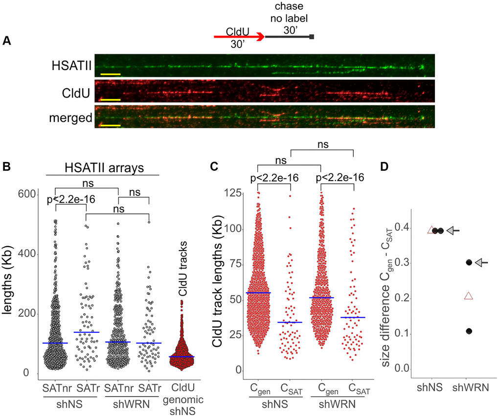 WRN’s effect on replication of any of the satellite repeats has not been studied, and likewise, the replication of SATII class of satellites is not characterized. We examined replication of the SATII satellites using a combination of fiber FISH and maRTA [64], which allowed us to see SATII arrays (green, Figure 10A) as well as replication tracks of CldU incorporation (red, Figure 10A) in stretched DNA fibers. SATII arrays in both control and WRN-depleted cells are on average long enough to encompass a fork progressing for 30 min at an average genomic rate (Figure 10B), however, replication track lengths enclosed within SATII arrays were still dramatically shorter than the global genomic average (compare CSAT and CGEN tracks in Figure 10C), indicating that SATII arrays somehow impede fork progression even in normal cells. In WRN-deficient cells, CGEN tracks were somewhat shorter than in the control, highlighting a subtly reduced global fork progression, as expected [4, 65]. Remarkably, however, replication tracks within SATII arrays, CSAT, were longer than the CSAT tracks of the control (Figure 10C). This translated into a reduced size of the difference between the genomic and the SATII-specific fork rates in WRN-depleted cells compared to the control (Figure 10D). These data suggest that, relative to each cell line’s average genomic fork progression, forks progress faster through the SATII arrays in WRN-deficient cells, a result that is contrary to the expected canonical role of WRN in replication described above.
