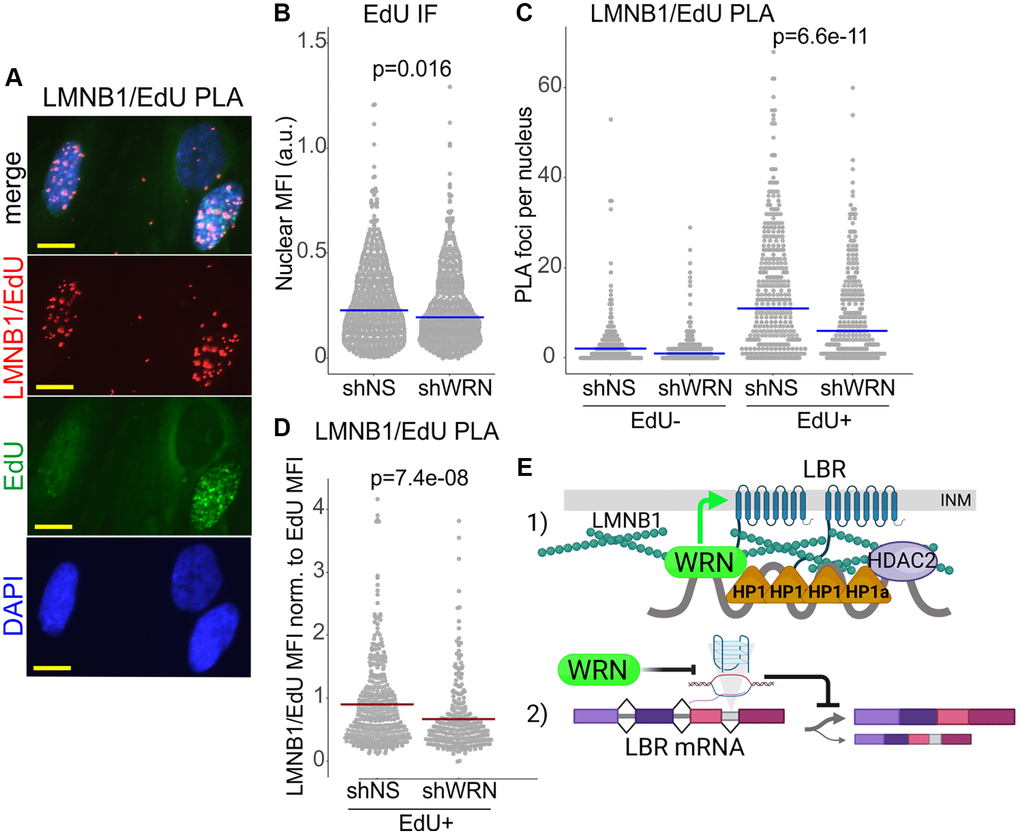 Though we were not able to see physical proximity of WRN to LBR or Lamin B1 with the antibodies used in this study, our findings of HP1α, HDAC2, and WRN associations agree with prior research [17] in indicating that WRN regulates LBR while also being a physical constituent of the protein assemblies of heterochromatin. We envision that WRN, HDAC2, and HP1α are proximal within the context of compacted heterochromatin. Their mutual proximity is dependent on heterochromatin tethering to LBR and Lamin B1 (Figure 11E) and can be downregulated by disruption of Lamin B1 or LBR levels or distribution, including at the onset of senescence. In its turn, WRN loss may cooperate with senescence triggers by partially disrupting CH, and thereby accelerating the onset of senescence.