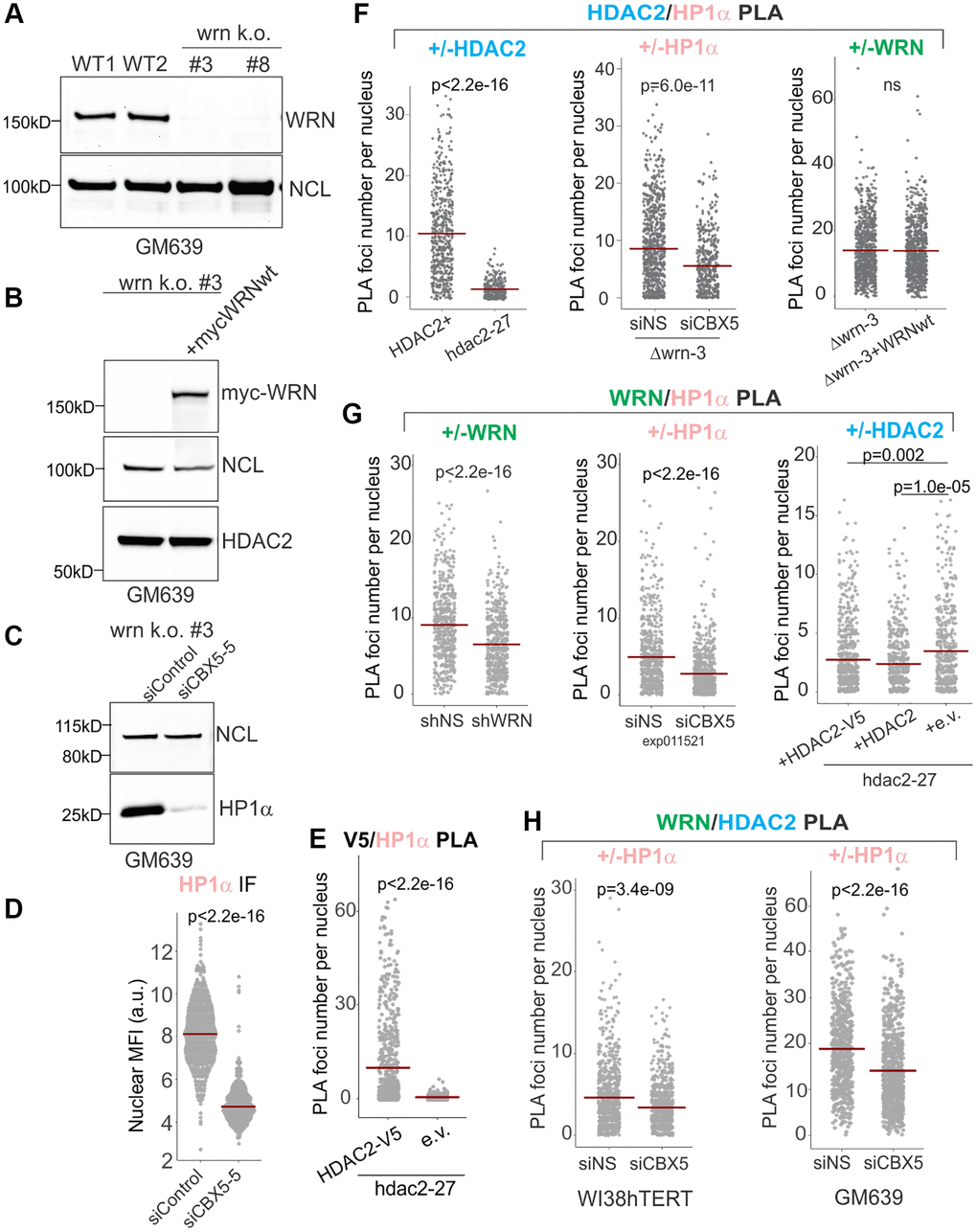 We used several isogenic pairs of cell lines to confirm WRN/HP1α and HDAC2/HP1α associations: (i) the hdac2-27 null and complemented cells described in the previous section, (ii) a CRISPR/Cas9 WRN KO derivative of GM639 Δwrn-3 (Figure 2A) that was stably transfected with a WRN-expressing construct (Figure 2B), (iii) the shRNA-mediated depletion of WRN described in the previous section (Figure 1), and (iv) siRNA-mediated depletion of HP1α (Figure 2C, 2D). Pairwise associations between HDAC2, HP1α, and WRN in cell nuclei were assessed by PLA in situ.