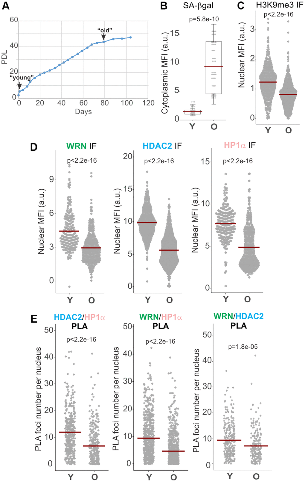 Given the findings that HDAC2 [24] and WRN [17] complexes may be altered in senescing cells, we examined how two distinct types of senescence, replicative senescence (RS) and oncogene-induced senescence (OIS) affect the state of WRN, HDAC2, and HP1α associations. Normal human dermal fibroblasts (NHDFs) were serially passaged and cryopreserved throughout to generate early and late population doubling level (PDL) cultures to compare side by side later. The PDL5 (“young”) and PDL47 (“old”) fibroblasts were chosen for comparison (Figure 3A, PDL values correspond to those at the beginning of the experimental series). Old fibroblasts exhibited slower growth but were not yet fully senesced, presenting a heterogeneous population of cells with normal or enlarged nuclei and an overall elevated level of senescence-associated, SA, β-gal staining (Figure 3B) and reduced mean fluorescence intensity (MFI) of H3K9me3 (Figure 3C). Nuclear MFIs of HDAC2, HP1α, and WRN in old cells were reduced compared to proliferating young cells in IF in situ assays (Figure 3D). Notably, all three of pairwise associations, HP1α/WRN, HDAC2/WRN, and HDAC2/HP1α, were also reduced in old fibroblasts compared to young (Figure 3E and Supplementary Figure 2). Of note, the total levels of these proteins in whole cell extracts appeared similar between old and confluent young fibroblasts, whereas sub-confluent, proliferating young fibroblasts showed modestly elevated WRN and HP1α levels (Supplementary Figure 3A) when quantified against NCL or GAPDH controls (Supplementary Figure 3B, 3C). The data suggest that WRN, HDAC2, HP1α densities and mutual proximities in the nuclei are downregulated in old primary fibroblasts or undergo changes resulting in lower detectability in situ.