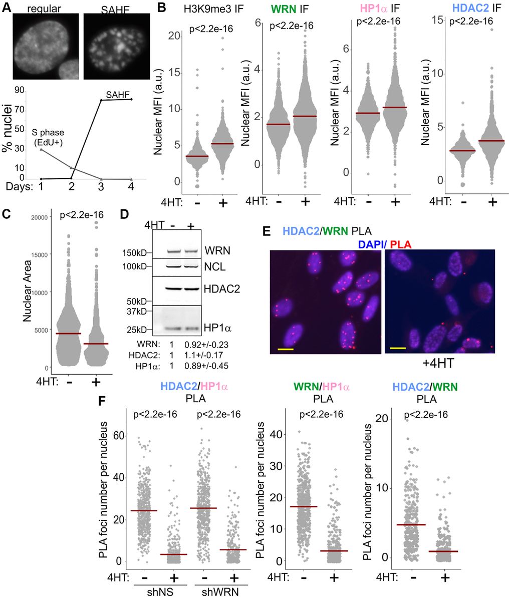 Oncogene-induced senescence, OIS, triggered by the overexpression of oncogenes such as RAF or RAS shares some features with replicative senescence, some of the key differences being a rapid, abrupt onset and the spatial reorganization of chromatin into senescence-associated heterochromatin foci, or SAHF [30], which appears to reflect contraction of the chromosomal territories [31–35] (Figure 4A). This, however, does not indicate a global heterochromatin dismantlement in RAF OIS [36–38], and indeed H3K9me3 is not reduced in OIS cells ([39], also see Figure 4B, left panel). At the same time, CH domains, including pericentromeres, may be selectively relaxed in OIS [40–42]. We used an inducible RAF model system [43] to trigger OIS in WI38hTERT by the addition of 4-HT to the cell media (Figure 4A). Nuclear MFIs of WRN, HP1α, and HDAC2 were higher in OIS cells compared to non-OIS controls (Figure 4B). These values could at least in part be explained by a reduction of nuclear area in OIS (Figure 4C), given the fact that total levels of HDAC2, WRN, and HP1α in whole cell extracts from OIS cells were comparable to those in proliferating cells (Figure 4D). Strikingly, however, the HP1α/WRN, HP1α/HDAC2, and WRN/HDAC2 PLA signals in OIS cells were drastically reduced (Figure 4E, 4F and Supplementary Figure 4), strongly suggesting that mutual associations of these proteins are downregulated in this type of senescence.
