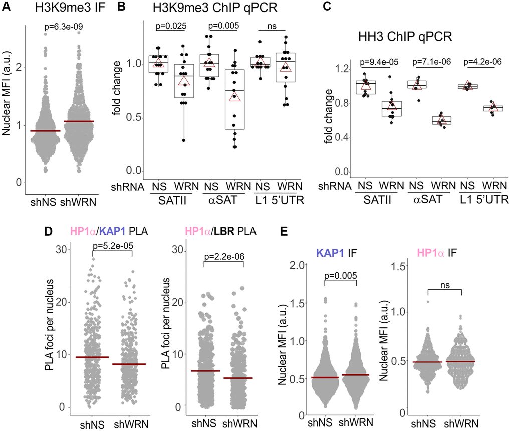 Antibodies were as follows: rabbit α-biotin Cat. No. A150-109A (Bethyl); mouse α-BrdU/CldU Cat. No. NBP2-44055 (Novus); rabbit α-STING Cat. No. 19851-1-AP (Proteintech), mouse α-NCL Cat. No. 396400 (Life Technologies), mouse α-Lamin A/C Cat. No. sc-376248 (Santa Cruz Biotechnology), rabbit α-GAPDH Cat. No. 5174 (CST), rabbit α-Histone H3K9me3 Cat. No. 13969 (CST), rabbit α-Histone H3K9me3 Cat. No. A2217P (Diagenode), mouse α-WRN, Cat. No. W0393 (Millipore-Sigma), rabbit α-WRN, Cat. No. NB100-471 (Novus); mouse α-HP1α Cat. No. NBP2-52420 (Novus), rabbit α-HP1α Cat. No. 2616 (CST); rabbit α-V5 Cat. No. 3202 (CST); rabbit α-KAP1 Cat. No. 4124 (CST); mouse α-HDAC2 Cat. No. 5113 (CST); rabbit α-HDAC2 Cat. No. 57156 (CST); rabbit α-LBR Cat. No. A5468 (ABclonal); mouse α-Lamin B1 Cat. No. 66095-1 (Proteintech).