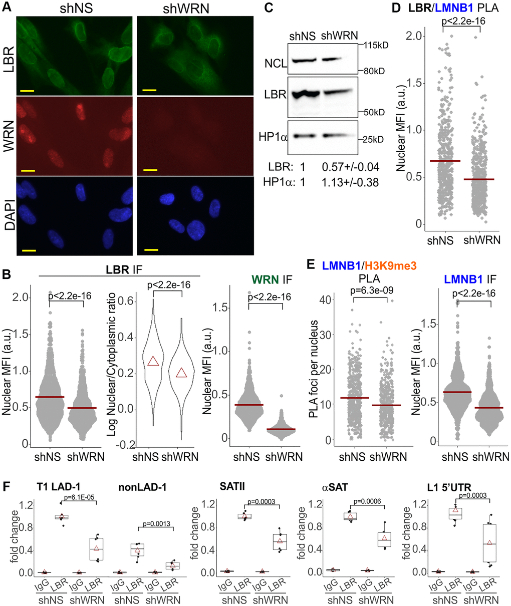 In contrast, WRN deficiency consistently reduced Lamin B1 and LBR levels and their functionally important associations with each other and with chromatin. Lamin B1 and LBR are responsible for tethering and compacting heterochromatin at the inner nuclear membrane, both via the HP1α protein and by directly interacting with other chromatin components [68, 69], and their ablation is sufficient to disrupt CH silencing [49, 50].