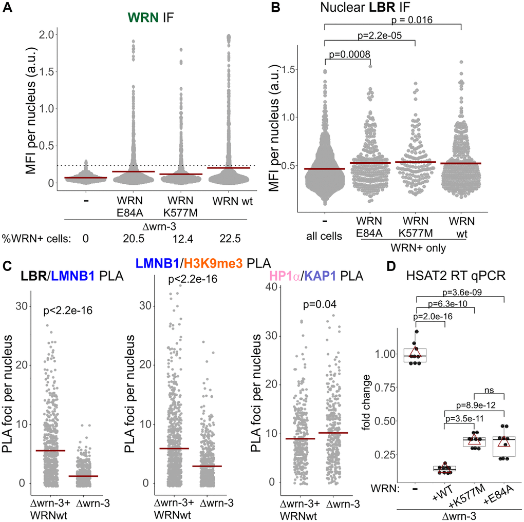 Nuclear LBR was also lower in Δwrn-3 GM639 fibroblasts compared to the same cells stably transfected with a lentiviral vector-based WRN transgene (Figure 7). The exonuclease or helicase-dead mutants of WRN, respectively, E84A and K577M, transfected and expressed from the same backbone (Figure 7A and Supplementary Figure 8), were comparable to the wild type WRN in their nuclear LBR levels (Figure 7B). In these experiments, only the LBR fluorescence readouts from WRN-positive cells were included in the measurement since only a subset of cells in these populations expressed detectable levels of WRN (wild type or mutant) and these levels varied (Figure 7A and Supplementary Figure 8). We could not measure WRN levels and PLA signal simultaneously due to an antibody conflict. With that caveat however, we could still observe that re-expression of the wild type WRN in Δwrn-3 cells led to an increase in Lamin B1/LBR and Lamin B1/H3K9me3 PLA signals compared to the uncomplemented Δwrn-3, whereas the HP1α/KAP1 signal was slightly decreased (Figure 7C). Thus, only the Lamin B1 and LBR functional associations and levels were the features consistently reduced by WRN deficiency, whereas HP1α was comparatively less affected.