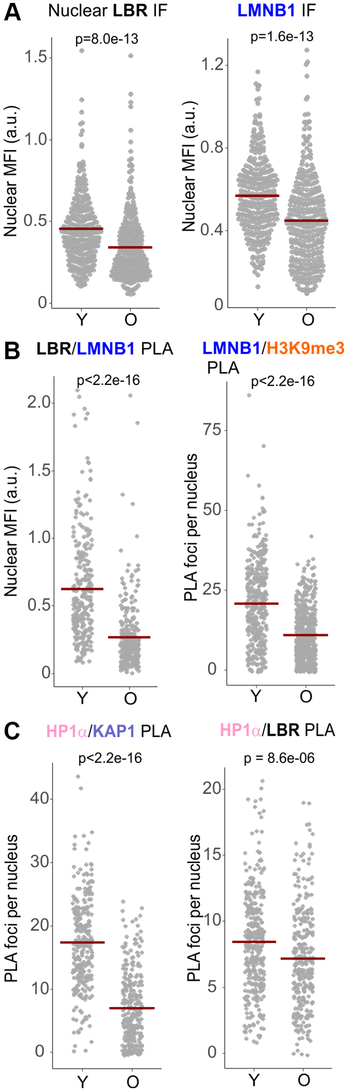 Reduction of Lamin B1 levels is a prominent feature of senescence [33, 51–54], and at least in some cell types, Lamin B1 or LBR can trigger senescence when depleted [49, 51, 55]. Indeed, both the nuclear levels of Lamin B1 and LBR (by IF in situ, Figure 8A) as well as associations of Lamin B1/LBR and Lamin B1/H3K9me3 (by PLA, Figure 8B) were also downregulated in replicative senescing old primary, WRN-proficient fibroblasts compared to the isogenic young fibroblasts. The HP1α/KAP1 PLA signal was also markedly reduced in old vs. young fibroblasts, while the HP1α/LBR signal was reduced to the least degree of all PLA pairs measured (Figure 8C). Nuclear Lamin B1 level was also profoundly reduced in WI38hTERT undergoing OIS, as expected (Supplementary Figure 7C). Interestingly, however, cellular levels of LBR did not appear to reduce in OIS cells, rather, subcellular distribution of LBR changed to a prominently cytoplasmic pattern (Supplementary Figure 7D, 7E). Together, the data indicate that WRN-deficient proliferating cells exhibit an overall milder yet overlapping set of perturbations of the heterochromatin tethering complexes as those seen in WRN-proficient senescing cells.