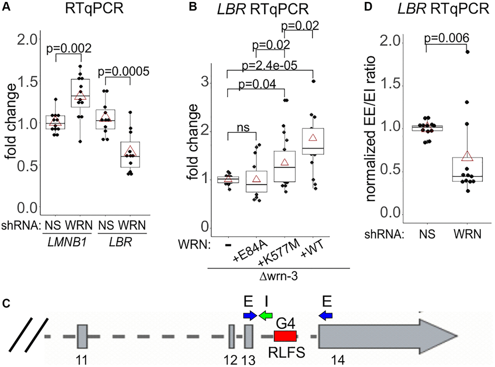The LBR primer pair that we used maps to exons 13 and 14, the two last exons of the gene, as it is designed to detect a full-length, spliced mRNA (Figure 9C). The approx. 1Kb-long intron 13 between these exons contains an R-loop forming sequence (hg38_RLFS range=chr1:225403587-225404027), recognized as a high confidence RLFS by R-loopBase [56], R-loopDB [57]), and RLBase [58]. Intron 13 RLFS is one of six such sequences in the introns of the LBR gene, all of which were experimentally verified to carry R loops in vivo as summarized in the above-mentioned databases. Moreover, the non-transcribed strand of the intron 13 RLFS is also rich in G4 motifs (chr1:225,403,870-225,404,030), which are recognized as G4-forming sites by G4Hunter Seeker [59]. We speculated that without WRN these secondary structures may be upregulated in LBR intron(s). Conceivably, this may downregulate splicing [60], thus reducing the amount of the spliced mRNA detectable in our qPCR. We repeated RT-qPCRs measuring both the spliced and the intron 13-containing transcripts (Figure 9D). Indeed, the ratio between the levels of qPCR products detecting the spliced (EE in Figure 9) and the unspliced (EI in Figure 9) cDNAs was about two-fold lower in WRN-depleted compared to control WI38hTERT, suggesting that at least the intron 13 of the transcript may be removed less efficiently.