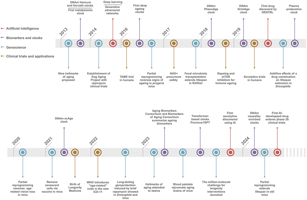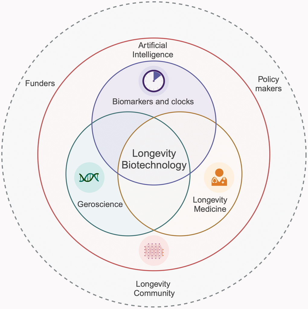 The emergence of longevity biotechnology as a standalone industry has led to the acceleration of the convergence of AI and ageing research [3], which led to notable advancements in longevity science, with AI playing an increasing role in biomarker identification, drug discovery, and clinical practice. The link between longevity and AI is expected to become even stronger, as AI is helping to understand the wider determinants of health, including how the environment influences gene expression, yielding new insights on how to increase the human healthy lifespan [7].