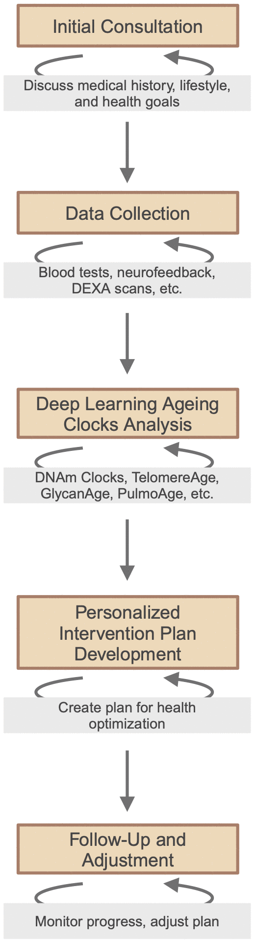 The emergence of longevity medicine, a personalised preventive medicine powered by deep biomarkers of ageing and longevity, is a paradigm shift from traditional, sickness-oriented healthcare towards a more proactive, AI-driven approach [115]. Highlighting the individualisation of patient care, this approach integrates data collection and analysis, from cellular biomarkers to advanced diagnostic techniques, to pave the road for more effective and personalised interventions [116]. Clinics specialising in longevity medicine are now adopting this data-driven approach, establishing longevity medicine protocols and standardized criteria, as well as laying the groundwork for broader accessibility and implementation of longevity interventions in clinical settings worldwide (Figure 2). New commercial platforms leverage the integration of blood biomarkers, DNA, physiological markers, health care records and user-generated data to optimize personal health and healthy longevity strategies [117].