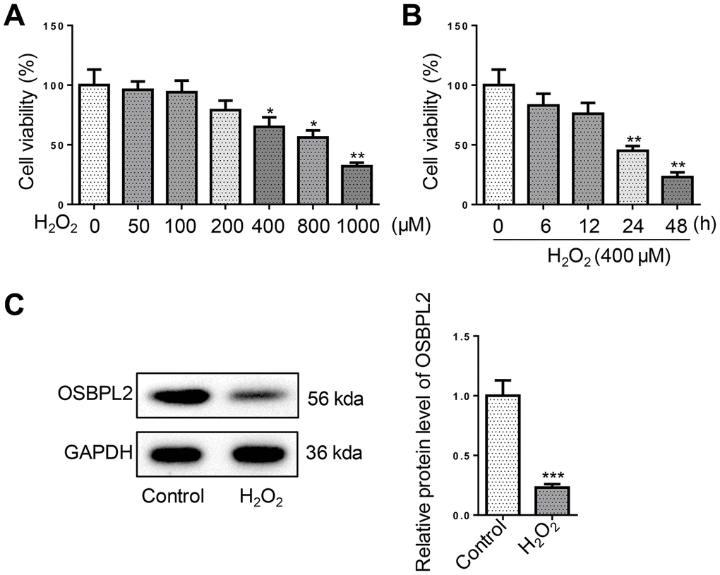 To simulate AHL in vitro, hair cell-like inner ear cells (HEI-OC1 cells) were exposed to H2O2 (50–1000 μM) for 1 h. As evidenced by CCK-8 assay, H2O2 treatment decreased cell viability of HEI-OC1 cells in a concentration-dependent manner (Figure 1A). In addition, 400 μM H2O2 treatment decreased cell viability of HEI-OC1 cells in a time-dependent manner (Figure 1B). Since HEI-OC1 cell viability was markedly reduced to about 50 % at 24 h after treatment with 400 μM H2O2, 400 μM was applied as the concentration of H2O2 treatment for subsequent functional assays. Western blotting results revealed that OSBPL2 expression was significantly decreased in HEI-OC1 cells after H2O2 treatment (Figure 1C). These data suggested that OSBPL2 might be associated with H2O2-induced HEI-OC1 cell damage.