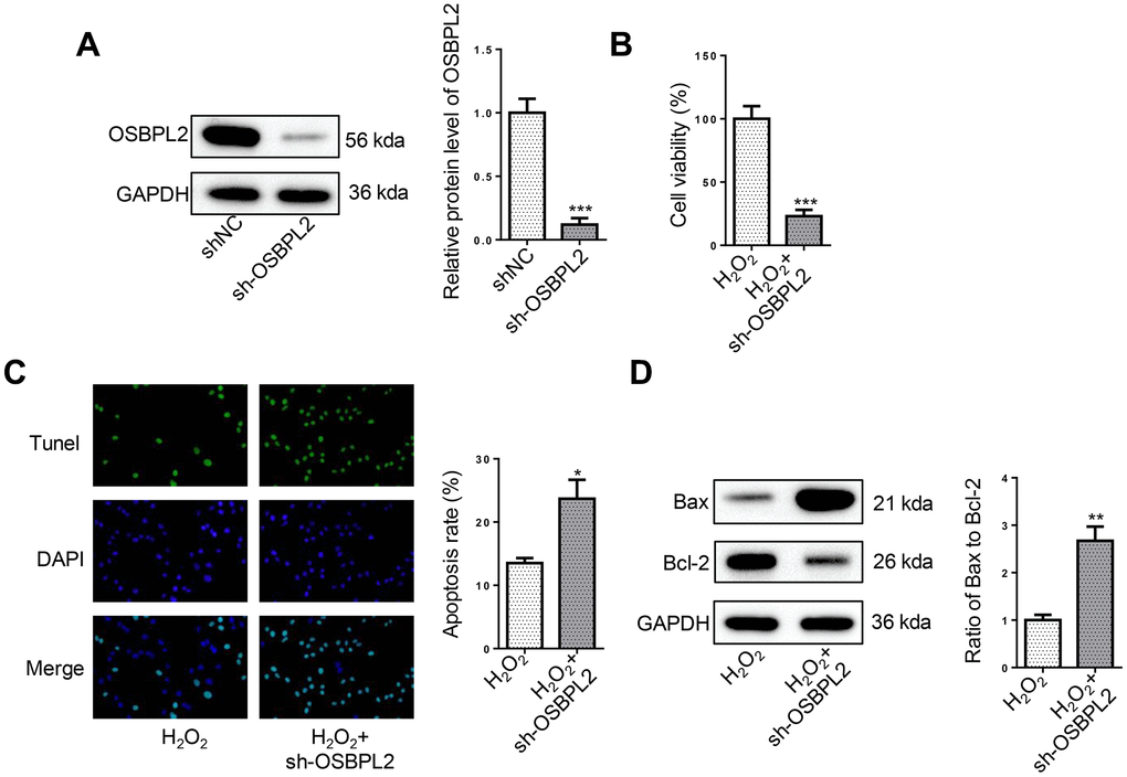 To investigate the effects of OSBPL2 disruption on the survival and apoptosis of H2O2-treated HEI-OC1 cells, OSBPL2 was first knocked down in HEI-OC1 cells and the efficiency was confirmed by western blotting (Figure 2A). CCK-8 results showed that OSBPL2 knockdown significantly inhibited the survival of H2O2-induced HEI-OC1 cells (Figure 2B). As illustrated by TUNEL results, OSBPL2 inhibition remarkably increased the apoptotic rate of HEI-OC1 cells in the presence of H2O2 (Figure 2C). Western blotting results further confirmed that OSBPL2 knockdown led to a significant increase in Bax/Bcl-2 ratio in H2O2-challenged HEI-OC1 cells (Figure 2D). Therefore, OSBPL2 knockdown promoted HEI-OC1 cell apoptosis.