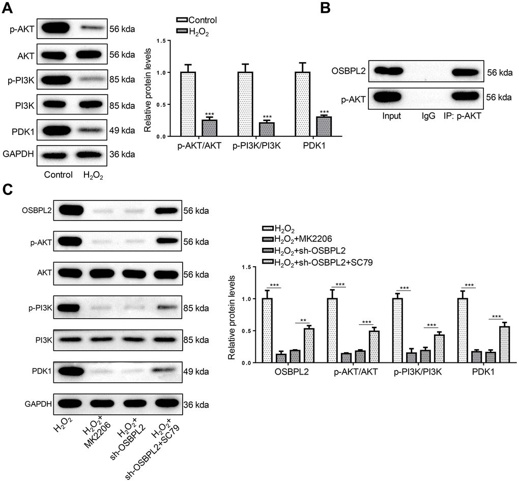 The inhibition of the PI3K/AKT signaling pathway is closely related to the development of AHL [24]. In addition, the PI3K/AKT signaling pathway development and survival of cochlea HCs [10]. Therefore, the expression of OSBPL2 and related proteins in the AKT signaling pathway (p-AKT, AKT, p-PI3K, PI3K, and PDK1) was detected by western blotting. Western blotting results showed that p-AKT, p-PI3K, and PDK1 protein levels were decreased in H2O2-treated HEI-OC1 cells, compared with normal HEI-OC1 cells (Figure 3A). Next, the interaction between OSBPL2 and p-AKT was assessed by co-IP assay. As shown in Figure 3B, there was an interaction between OSBPL2 and p-AKT in HEI-OC1 cells. To verify the interaction between OSBPL2 and p-AKT, an AKT inhibitor (MK2206) and an AKT activator (SC79) were applied to treat HEI-OC1 cells. H2O2, H2O2+MK2206, H2O2+sh-OSBPL2, and H2O2+sh-OSBPL2+SC79 groups. Western blotting results showed that MK2206 significantly inhibited the expression levels of OSBPL2 and AKT-related proteins in HEI-OC1 cells; SC79 upregulated OSBPL2 expression in OSBPL2-silenced HEI-OC1 cells and partially reversed the inhibition of the AKT signaling pathway mediated by OSBPL2 deletion (Figure 3C). These results indicated that OSBPL2 knockdown led to AKT inactivation in vitro.