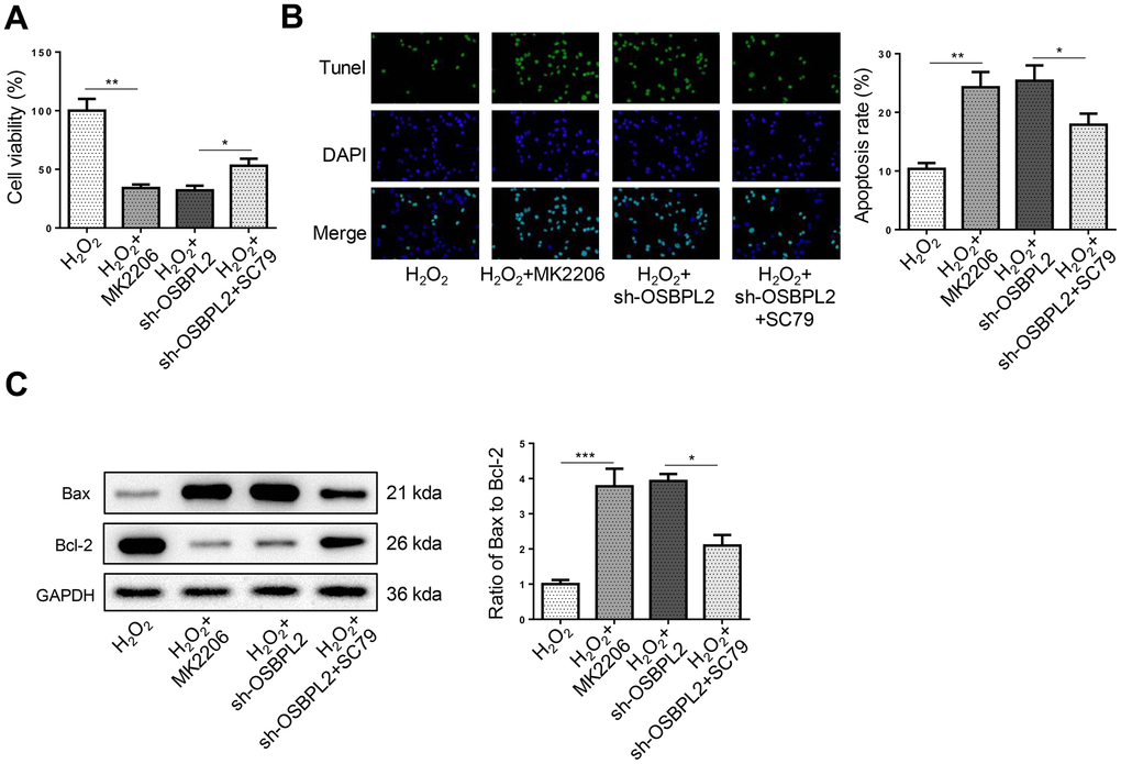 Next, the effects of the AKT signaling on HEI-OC1 cell apoptosis were further evaluated. CCK-8 and TUNEL results showed that MK2206 reduced the viability of HEI-OC1 cells and promoted HEI-OC1 cell apoptosis, whereas SC79 treatment abrogated the effects of OSBPL2 silencing on HEI-OC1 cell viability and apoptosis (Figure 4A, 4B), which was further confirmed by the changes in Bax/Bcl-2 rate in HEI-OC1 cells (Figure 4C). These results indicated that AKT activation reversed OSBPL2 knockdown-mediated HEI-OC1 cell apoptosis.