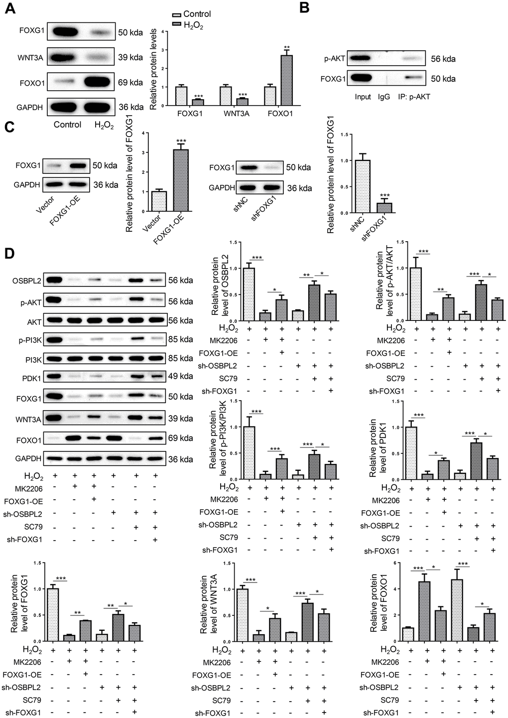 To further verify the relationship between OSBPL2, AKT signaling pathway, and FOXG1, HEI-OC1 cells were assigned to H2O2, H2O2+MK2206, H2O2+MK2206+FOXG1-OE, H2O2+sh-OSBPL2, H2O2+sh-OSBPL2+SC79, and H2O2+sh-OSBPL2+SC79+sh-FOXG1 groups. First, FOXG1 overexpression and knockdown efficiencies were verified by western blotting (Figure 5C). Western blotting results showed that FOXG1 overexpression reversed MK2206-induced inhibition of AKT and FOXG1 signaling pathways in H2O2-induced HEI-OC1 cells; moreover, FOXG1 silencing partially abated the effects of SC79 on OSBPL2 knockdown-mediated inactivation of AKT and FOXG1 signaling pathways in H2O2-challenged HEI-OC1 cells (Figure 5D). These results suggested that OSBPL2 activated the FOXG1 signaling pathway by activating the AKT signaling pathway in HEI-OC1 cells.
