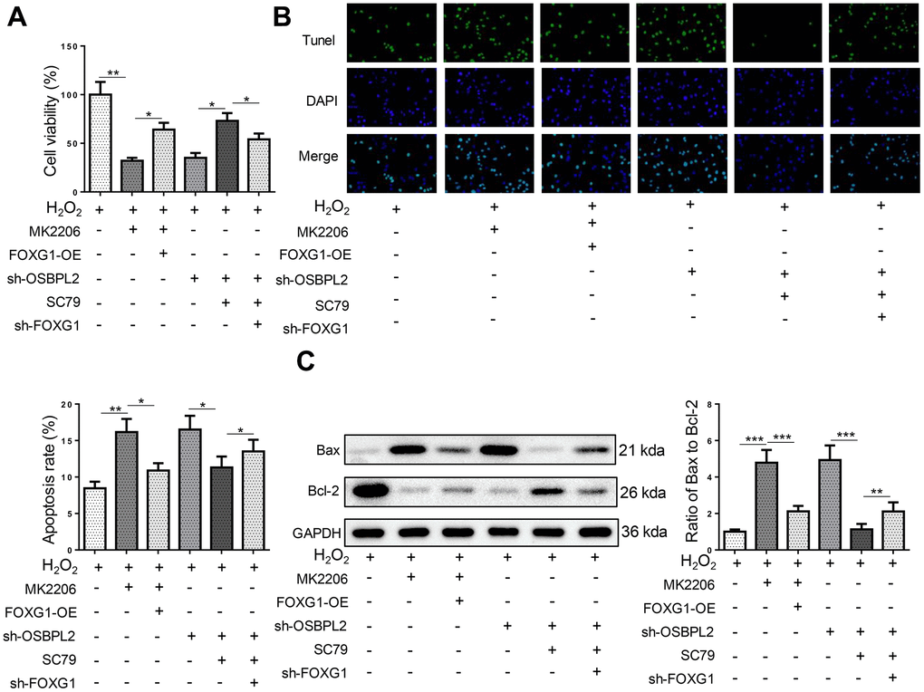 Next, the impact of FOXG1 on H2O2-induced HEI-OC1 cells was assessed. It was shown that FOXG1 silencing significantly reversed the mitigatory effects of SC79 on HEI-OC1 cell apoptosis caused by OSBPL2 knockdown (Figure 6A–6C). Therefore, OSBPL2 inhibition promoted HEI-OC1 cell apoptosis by downregulating FOXG1 expression via AKT deactivation.
