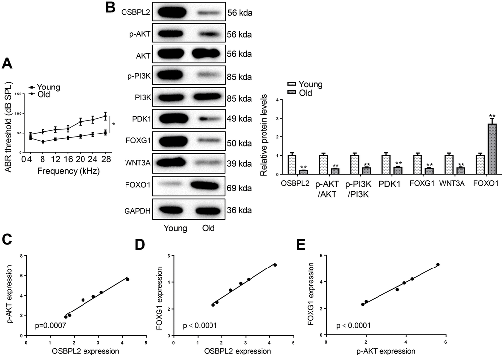 C57BL/6 mice are recognized for their propensity for early-onset hearing loss, making them commonly employed as in vivo models for AHL [23]. To examine the hearing function of C57BL/6 mice, we performed ABR tests on young (4 weeks old) and old (12 months old) C57BL/6 mice. As shown in Figure 7A, the ABR thresholds of old mice were significantly higher than those of young mice; In addition, the hearing loss also appeared severe at a higher frequency range, indicating a decline of auditory function in aged mice. Then, the expression levels of OSBPL2, AKT-related proteins, and FOXG1-related proteins were detected in the cochleae of young and old C57BL/6 mice. Consistent with the results obtained from in vitro assays, aged C57BL/6 mice exhibited significantly lower OSBPL2 expression and inactivation of the AKT and FOXG1 signaling pathways (Figure 7B). OSBPL2 expression was positively correlative to p-AKT and FOXG1 expression (Figure 7C, 7D). In addition, p-AKT expression was also positively correlated to FOXG1 expression (Figure 7E). These results further supported our in vitro findings that OSBPL2 inhibition contributed to AHL via the AKT/FOXG1 signaling pathway.