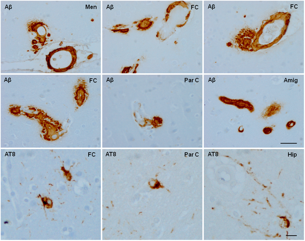 Diffuse plaques, primitive plaques, and classical plaques were stained with anti-Aβ42(43) antibodies; diffuse plaques and only about one-third of classical plaques were not stained with anti-Aβ40. CAA in arterioles reacted with anti-Aβ42(43) and anti-Aβ40 antibodies; cortical capillaries were decorated with anti-Aβ42(43) but rarely with anti-Aβ40. APP, ubiquitin, and microtubule-associated protein-2, but not tau, accumulated in the swollen neurites of mature plaques [112, 113].