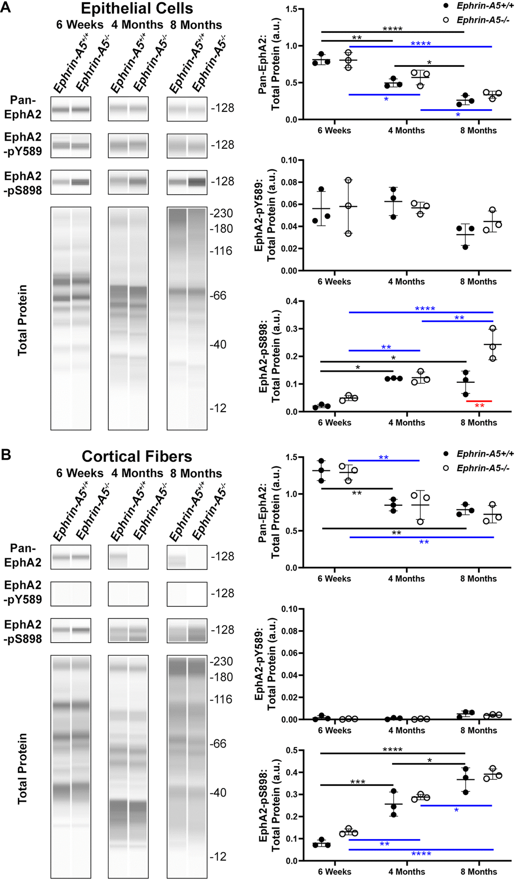 Within the cortical fiber cells (Figure 1B), the pan-EphA2 protein decreased between 6-week-old and 4-month-old and between 6-week-old and 8-month-old control and KO samples. However, there was no further decrease in pan-EphA2 levels between 4 and 8 months of age. There was no difference in pan-EphA2 levels between ephrin-A5 control and KO age-matched samples. Canonically active EphA2-pY589 protein was absent from fiber cells of all ages. Non-canonically active EphA2-pS898 protein was found to be abundantly present in cortical fiber cells, and there was an obvious increase in EphA2-pS898 levels with age. Ephrin-A5 control and KO age-matched samples had comparable EphA2-pS898 levels. Similar to the epithelial cell sample Westerns, we observe an increase in the height of the bands for pan-EphA2 and EphA2-pS898 in the cortical fiber cell samples from 4-month-old and 8-month-old control and KO samples, presumably due to cleavage or post-translational modifications of EphA2 with age. These data show that canonical activation of EphA2 was restricted to the epithelial cells and does not change with age or genotype. Surprisingly, non-canonical activation of EphA2 is detected in ephrin-A5 control and KO epithelial cells and fiber cells. The level of pan-EphA2 decreased significantly with age, but there was an obvious increase in non-canonical EphA2 activation with age and in 8-month-old ephrin-A5-/- epithelial cells.