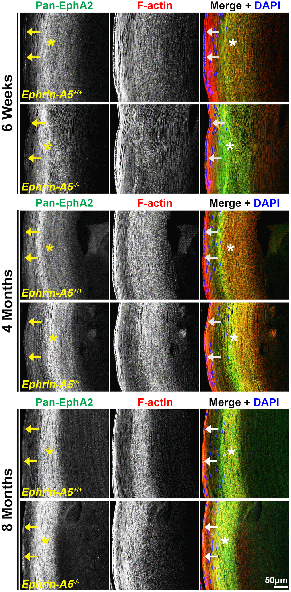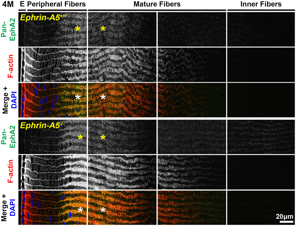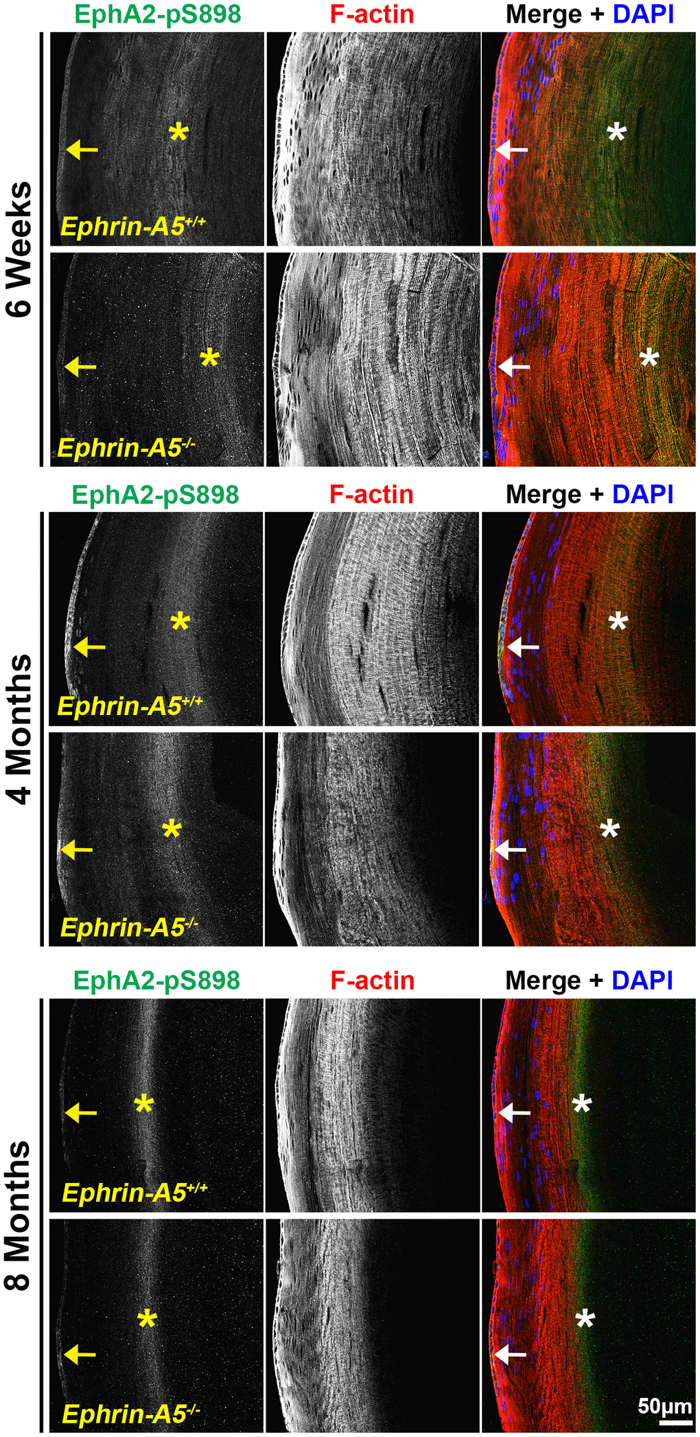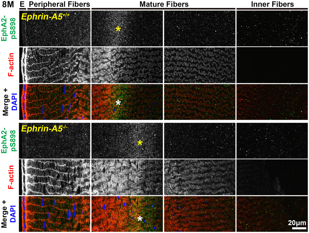 Finally, we immunostained lens sections to reveal where non-canonical EphA2-pS898 signaling is active. In low magnification images of longitudinal sections from ephrin-A5+/+ and ephrin-A5-/- mice, EphA2-pS898 staining showed localization to the epithelium (Figure 7, arrows) and a specific subset of mature fiber cells in the lens cortex (Figure 7, asterisks). The band of fluorescence in the mature fiber cells appeared more diffuse in 6-week-old sections, and the staining signal in those fibers compresses with age into a narrower band. Though the fluorescence signal in the fiber cells appeared to change with age, the same subset of mature cells was stained in sections from all ages. The EphA2-pS898-positive mature fiber cells are in a region where these cells have just eliminated their cellular organelles. With continued differentiation of the mature fibers as they are compacted toward the center of the lens, the EphA2-pS898 staining signal is lost. The compression of the fluorescence signal with age is due to the continuous addition of fiber cells in concentric shells in the lens cortex and the lens capsule that restricts the expansion of the tissue. This compression of signal can also be observed in the DAPI channel (blue) where the nuclei in the lens periphery were similarly compressed. There were no obvious differences between ephrin-A5+/+ and ephrin-A5-/- lens sections in each age group.