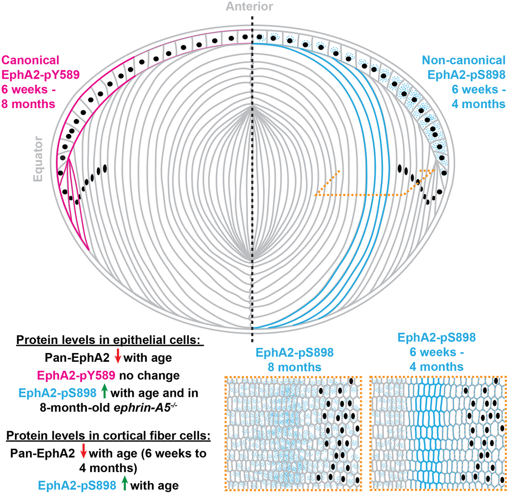 Here, we demonstrated the presence and location of canonical and non-canonical EphA2 signaling within the eye lens (Figure 11). While previous work assumed that EphA2 signals canonically by binding to a ligand in the lens, our work is the first direct evidence that EphA2 is activated by a ligand, and that this bidirectional EphA2 signaling is restricted to epithelial cells, especially at the lens equator. These data further support the role of bidirectional EphA2 signaling in lens epithelial cells to regulate hexagonal cell shape and the formation of organized rows of epithelial and fiber cells [41]. Our Western blots show that the amount of total EphA2 receptor significantly decreased with age in both epithelial and cortical fiber cell fractions. Despite this decrease in protein level, the level of canonical EphA2 activation (pY589) remains steady with age in both control and ephrin-A5-/- lens epithelial cells. Decreased EphA2 protein levels do not dampen this ligand-mediated activation of the receptor. The lack of obvious changes in canonical EphA2 activation in ephrin-A5-/- lenses indicates that ephrin-A5 is unlikely to be an exclusive binding partner for EphA2 in the lens, as we previously hypothesized [38, 75].