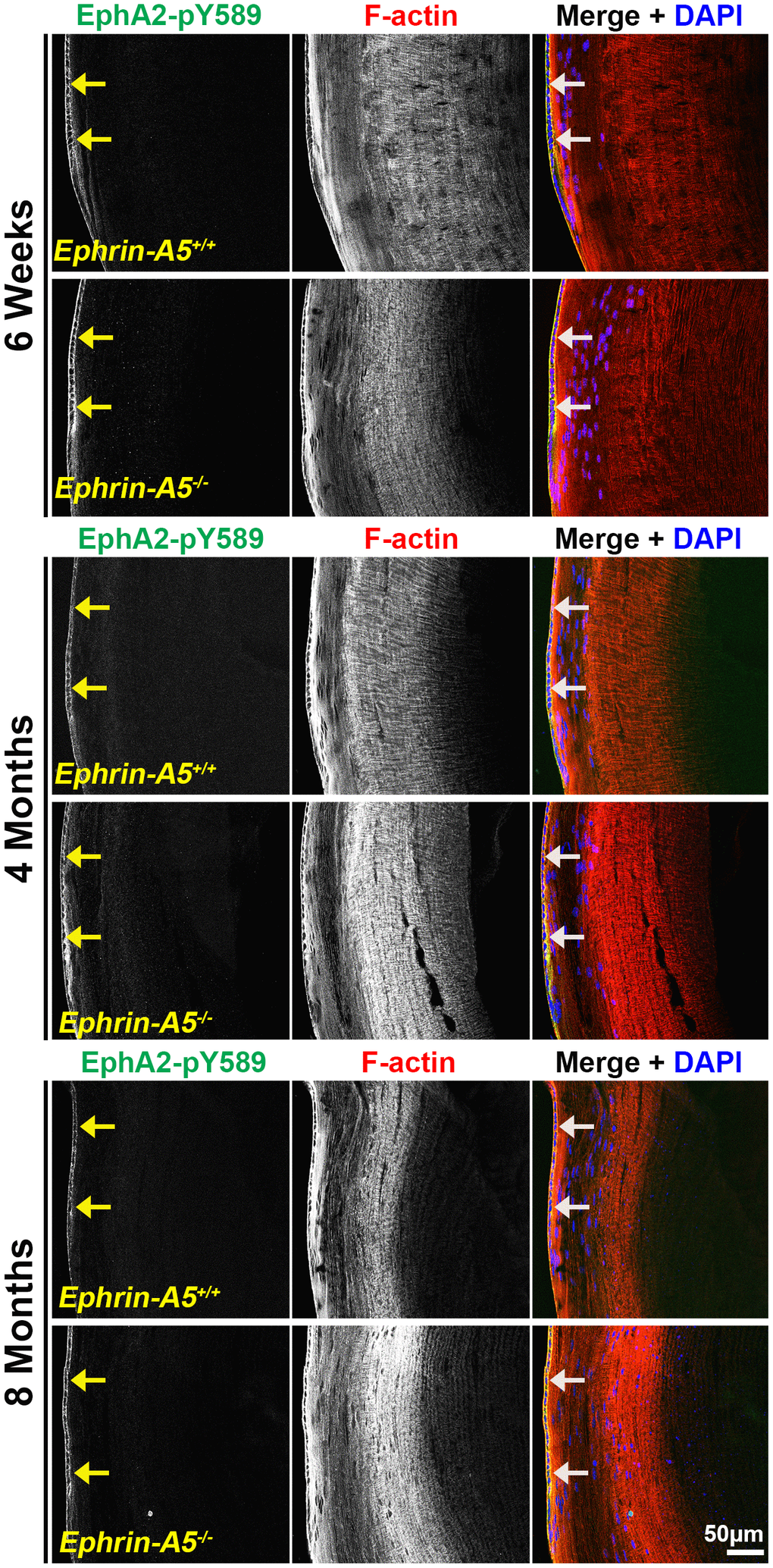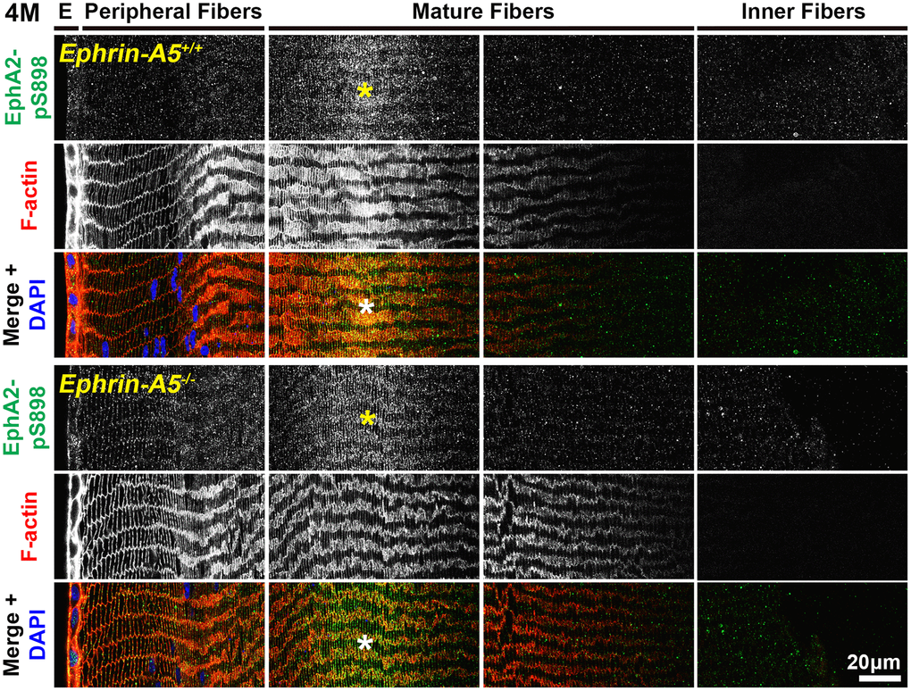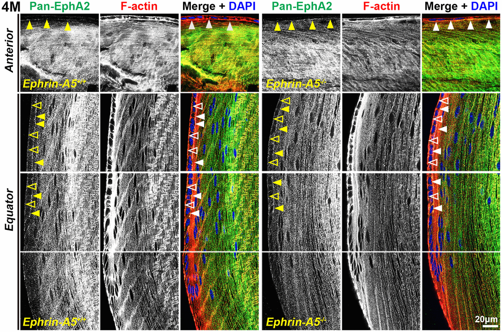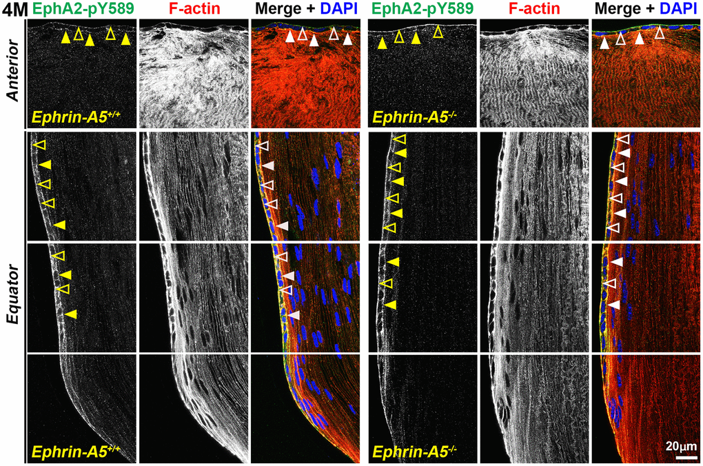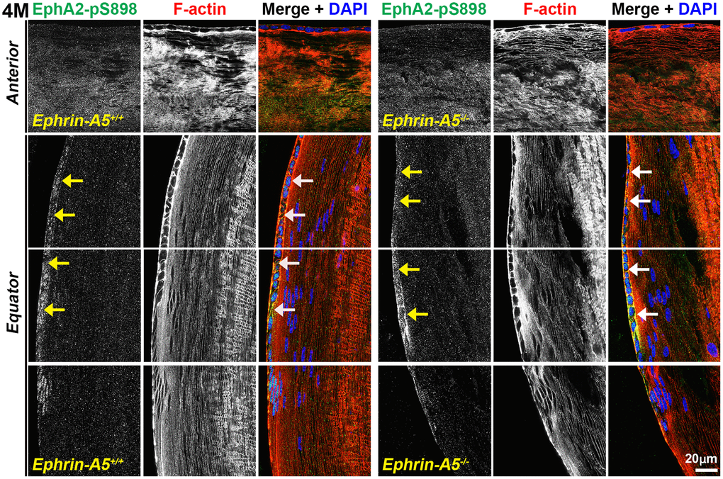 To further investigate the localization of these signaling pathways, immunostaining was performed on frozen lens sections in the longitudinal and cross orientations from 6-week-old, 4-month-old, and 8-month-old ephrin-A5+/+ and ephrin-A5-/- mice. Sections were stained with pan-EphA2 antibody, EphA2-pY589 antibody, or EphA2-pS898 antibody and counterstained with phalloidin for F-actin and DAPI for cell nuclei. Antibody specificity was confirmed with EphA2-/- frozen sections (Supplementary Figure 4), and the staining signal between EphA2+/+ and ephrin-A5+/+ sections were consistent. The staining signals were comparable between sections from 6-week-old, 4-month-old, and 8-month-old ephrin-A5+/+ and ephrin-A5-/- mice. For some data sets, we will only include the 4-month-old data in the main text as representative data, and the 6-week-old and 8-month-old data can be found in the supplement.
