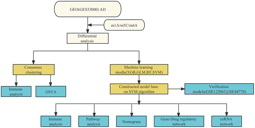 This study elucidated the involvement of the m6A/m1A/m5C regulator in AD development and its link to immune cell infiltration. The selected 5-gene-based SVM model emerged as the optimal machine learning tool for precisely assessing the risk of distinct AD subtypes. Additionally, the construction of gene-drug regulatory and ceRNA networks provided deeper insights into the molecular regulatory mechanisms of AD. It is crucial to note that all conclusions drawn are based on the analysis of publicly available data, emphasizing the necessity for further validation through additional clinical data collection and experimental studies.