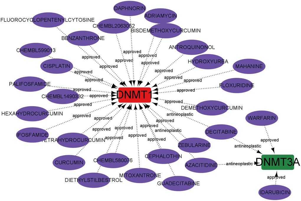 The Drug-Gene Interaction Database was utilised for predicting potential drugs targeting the hub genes, and the relationships between genes and drugs were examined. By inputting the five core genes into the DGIdb website, only two core genes related to predictive drug information were retrieved and visualised by using Cytoscape software. Overall, 29 drugs acting on the hub genes were identified. Among them, four drugs targeted DNMT3A, and 27 drugs targeted DNMT1. Notably, Decitabine and azacytidine may exhibit therapeutic efficacy in AD by targeting the expression of DNMT1 and DNMT3A. Unfortunately, drug targets for ALKBH1, METTL3, and YTHDF1 were not predicted (Figure 10).